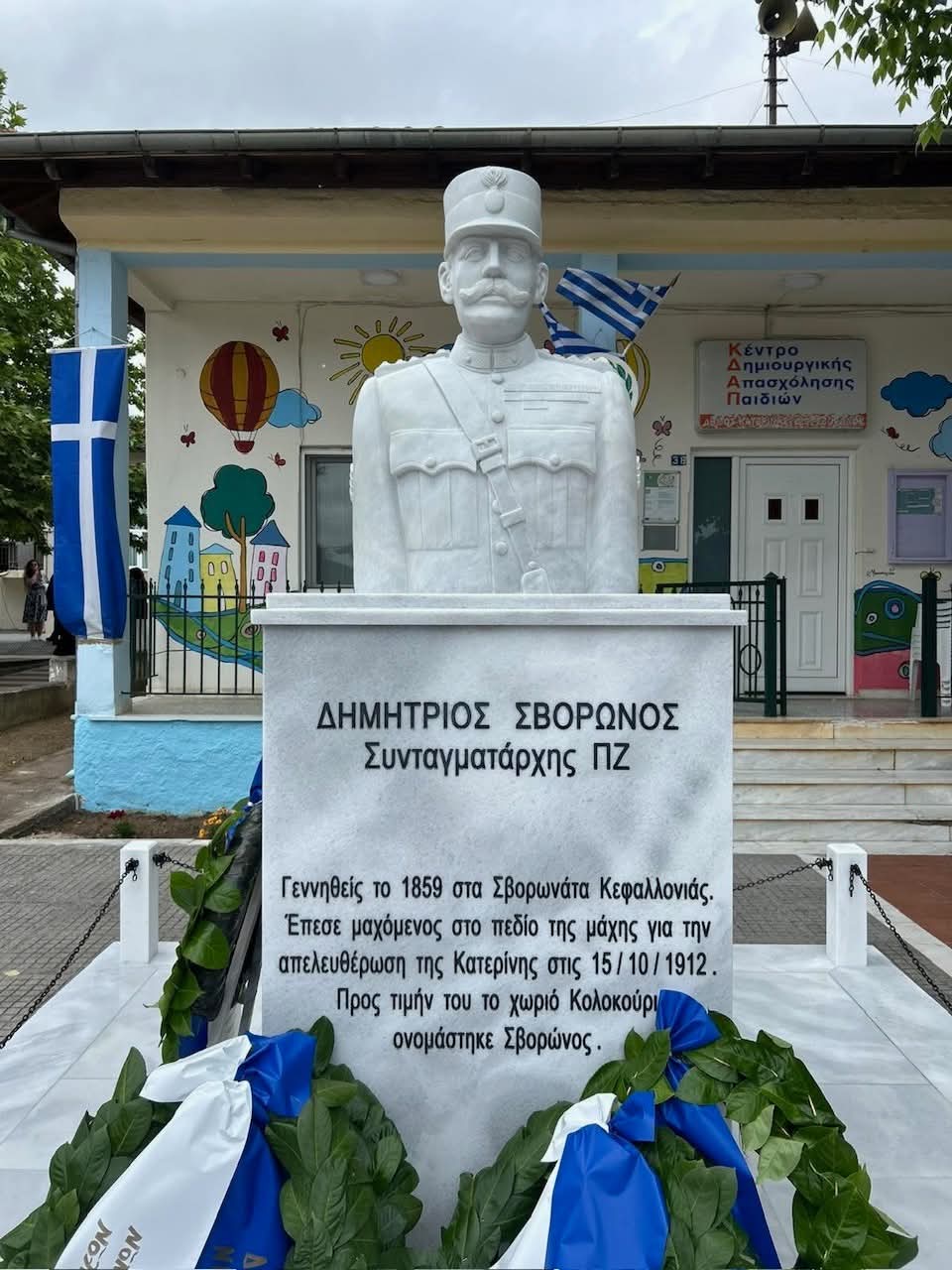 Στη συνέχεια, με την παρουσία των τοπικών Αρχών και όλου του εκκλησιάσματος πραγματοποιήθηκε επετειακή εκδήλωση στο προαύλιο του Ιερού Ναού. Η εκδήλωση άρχισε με προσφωνήσεις επισήμων, την εκφώνηση ειδικής ομιλίας από την Σύμβουλο Φιλολόγων Ν. Πιερίας Βαΐα Αγγέλη και τα αποκαλυπτήρια προτομής του Συνταγματάρχη Σβορώνου, που φιλοτεχνήθηκε με φροντίδα του τοπικού Πολιτιστικού Συλλόγου. Η εκδήλωση ολοκληρώθηκε με καταθέσεις στεφανιών και την ανάκρουση του Εθνικού Ύμνου.