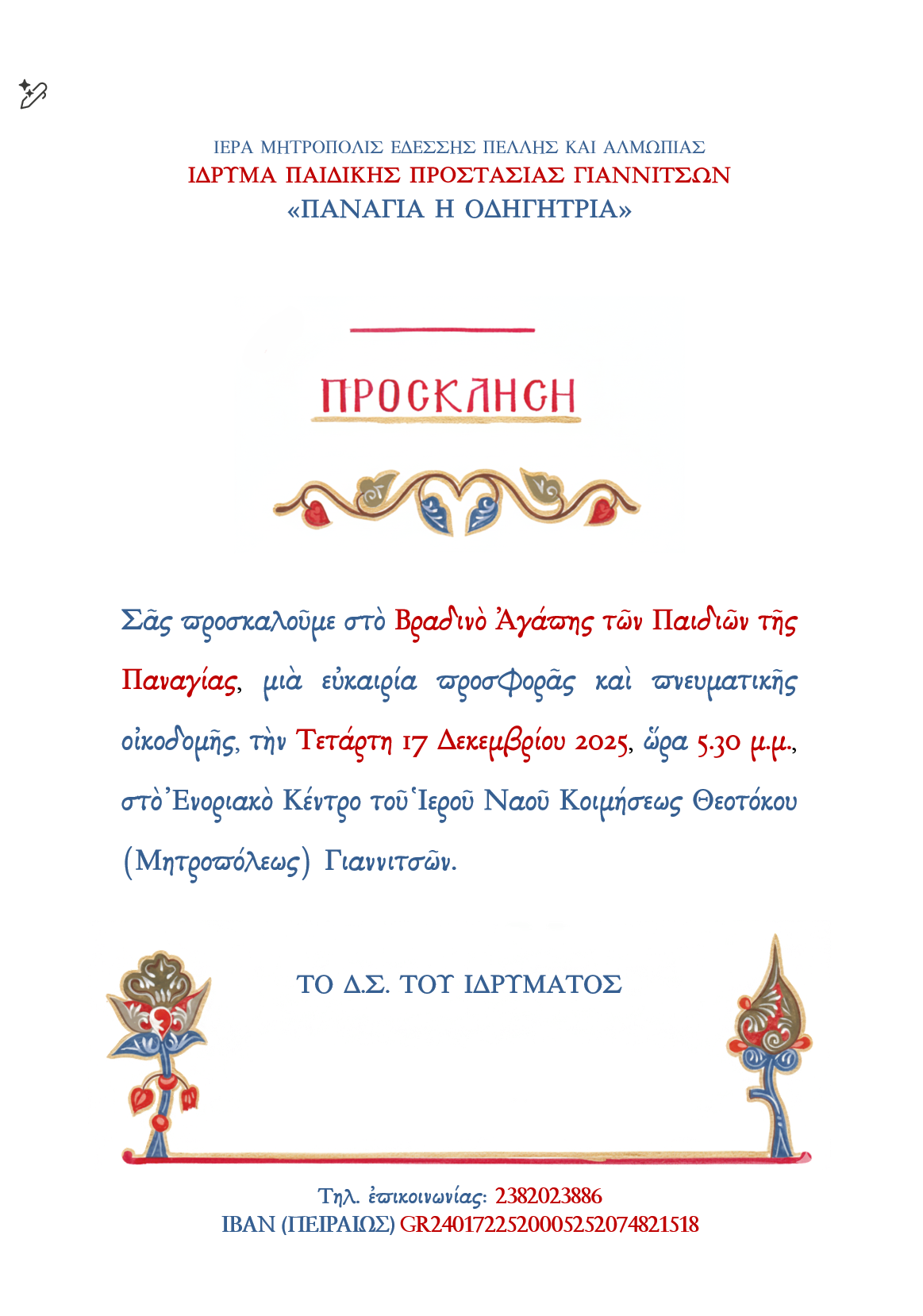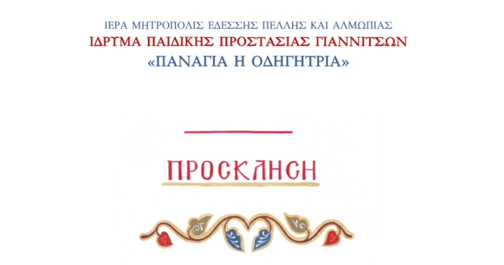 Την Τετάρτη 17 Δεκεμβρίου 2025 το Ίδρυμα Παιδικής Προστασίας «Παναγία η Οδηγήτρια» της ενορίας Κοιμήσεως της Θεοτόκου (Μητροπόλεως) Γιαννιτσών διοργανώνει Βραδινό Αγάπης, το οποίο θα πραγματοποιηθεί στις 5.30 μ.μ. στην Αίθουσα Εκδηλώσεων της ενορίας.