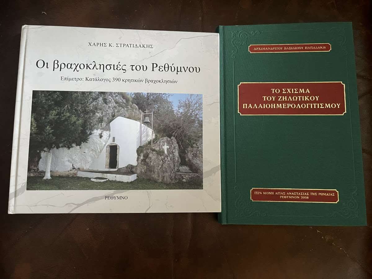 Επίσης, ο Σεβασμιώτατος διένειμε, ως ευλογία, σε όλους το βιβλίο του Πανοσιολ. Αρχιμ. Βασιλείου Παπαδάκη, Ηγουμένου της Ιεράς Μονής Αγίας Αναστασίας της Ρωμαίας Ρεθύμνης και Ιεροκήρυκος της Ιεράς Μητροπόλεως, με τίτλο: «ΤΟ ΣΧΙΣΜΑ ΤΟΥ ΖΗΛΩΤΙΚΟΥ ΠΑΛΑΙΟΗΜΕΡΟΛΟΓΙΤΙΣΜΟΥ», και το βιβλίο του κ. Χάρη Κ. Στρατιδάκη με τίτλο: «Οι βραχοκλησιές του Ρεθύμνου».