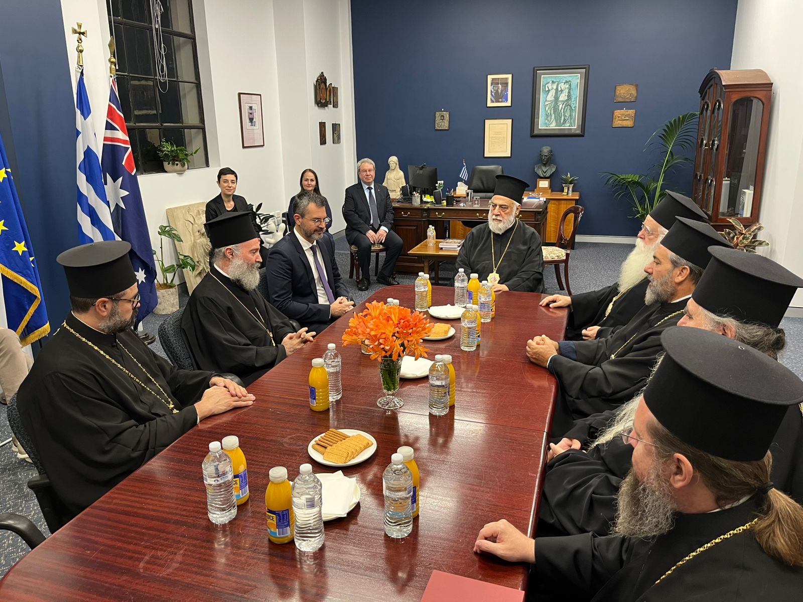 Την Πέμπτη, 25 Σεπτεμβρίου, ο Σεβασμιώτατος Αρχιεπίσκοπος Αυστραλίας κ. Μακάριος συνόδευσε τους προσκεκλημένους στη Β´ Παναυστραλιανή Ιερατική Σύναξη Αρχιερείς στο Γενικό Προξενείο της Ελλάδος στο Σύδνεϋ, όπου πραγματοποίησαν εθιμοτυπική επίσκεψη.