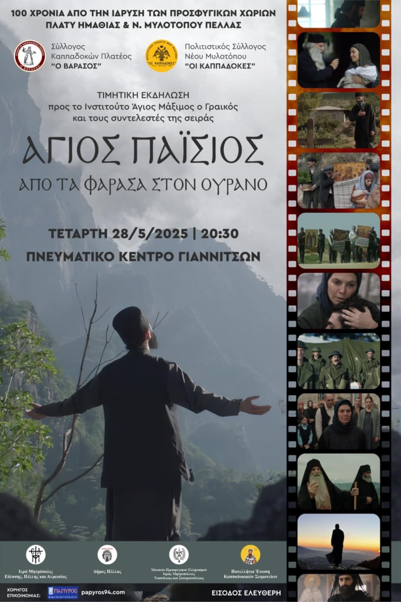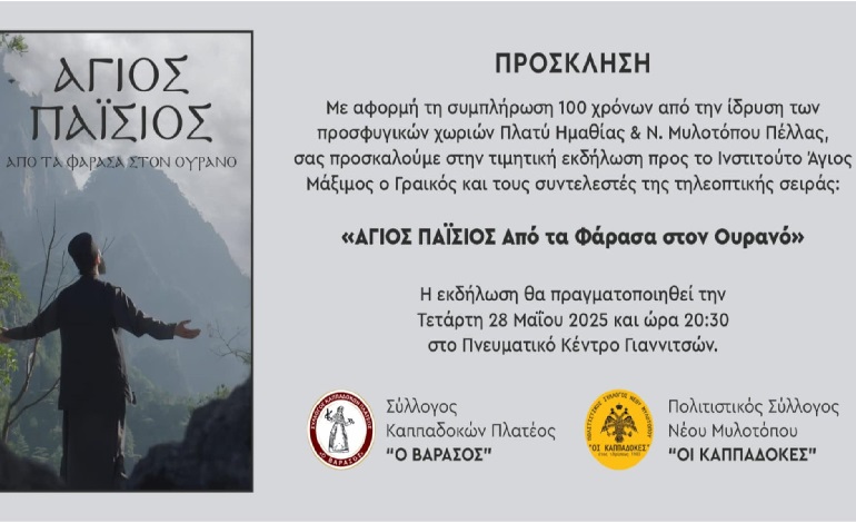 Οι Σύλλογοι Καππαδοκών, Πλατέος Ημαθίας «Ο Βαρασός» και Ν. Μυλοτόπου Πέλλας «Οι Καππαδόκες», διοργανώνουν υπό την αιγίδα της Ιεράς Μητροπόλεως Εδέσσης, Πέλλης και Αλμωπίας τιμητική Εκδήλωση – Αφιέρωμα στους συντελεστές της τηλεοπτικής σειράς «Από τα Φάρασα στον ουρανό».
