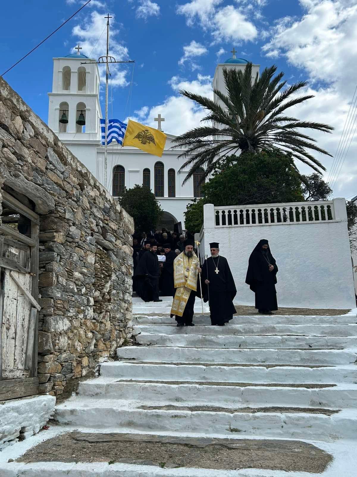 Στην εξόδιο ακολουθία προεξήρχε ο Σεβασμιώτατος Μητροπολίτης Θήρας, Αμοργού & Νήσων κ. Αμφιλόχιος, εκπροσωπώντας τον Μακαριώτατο Αρχιεπίσκοπο Αθηνών και Πάσης Ελλάδος κ. Ιερώνυμο Β’, συμμετέχοντος του Σεβασμιωτάτου Μητροπολίτου Σύρου κ. Δωροθέου Β’, ενώ ο Σεβασμιώτατος Μητροπολίτης Παροναξίας κ. Καλλίνικος προσελθών πολύ ενωρίτερα και αδυνατώντας να παραμείνει λόγω της δυσχερούς ενδοεπικοινωνίας των νησιών κατά την χειμερινή περίοδο, ετέλεσε νεκρώσιμο τρισάγιο. Ο κ. Αμφιλόχιος, ο οποίος προ της εξοδίου ακολουθίας ετέλεσε ενώπιον του σκηνώματός του μακαριστού προκατόχου του την Ακολουθία των Προηγιασμένων Τιμίων Δώρων, στον επικήδειο λόγο του εξήρε την ταπεινότητα, την απλότητα και το πνευματικό έργο του προκατόχου του, τονίζοντας μεταξύ άλλων ότι: