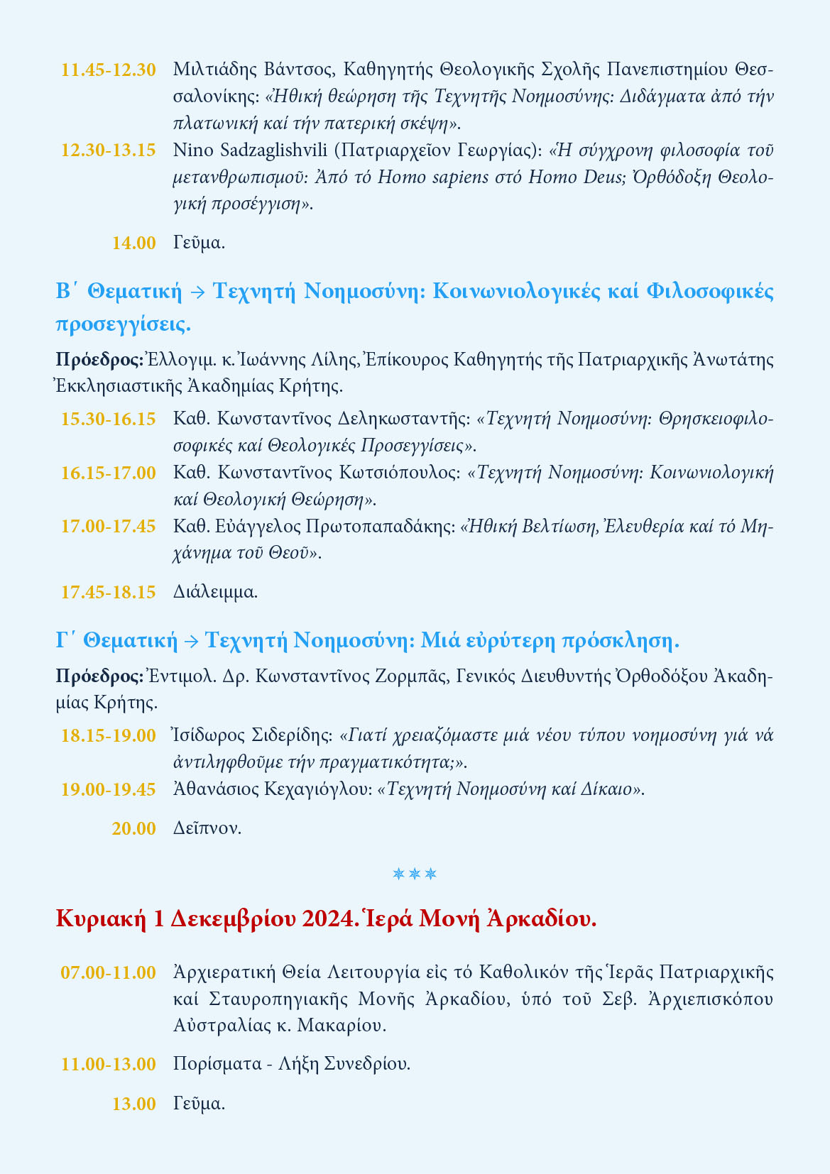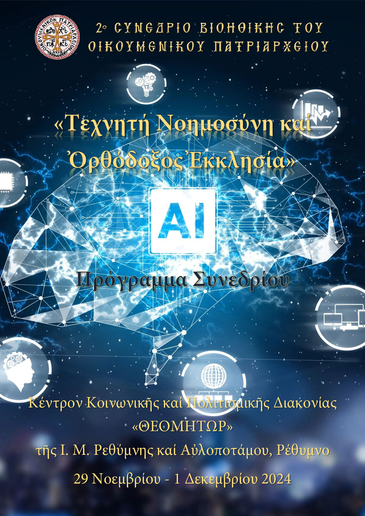 Η Ιερά Μητρόπολις Ρεθύμνης και Αυλοποτάμου, με την Ευχή και την Ευλογία του Παναγιωτάτου Οικουμενικού μας Πατριάρχου κ.κ. ΒΑΡΘΟΛΟΜΑΙΟΥ, θα φιλοξενήσει, στο Ρέθυμνο, το 2ο Συνέδριο Βιοηθικής του Οικουμενικού Πατριαρχείου με το γενικό θέμα: «Τεχνητή Νοημοσύνη και Ορθόδοξος Εκκλησία», το οποίο θα πραγματοποιηθεί από την 29η Νοεμβρίου έως την 1η Δεκεμβρίου 2024, στους χώρους του Κέντρου Πολιτισμικής και Κοινωνικής Διακονίας «ΘΕΟΜΗΤΩΡ» και στην Ιερά Πατριαρχική και Σταυροπηγιακή Μονή Αρκαδίου.