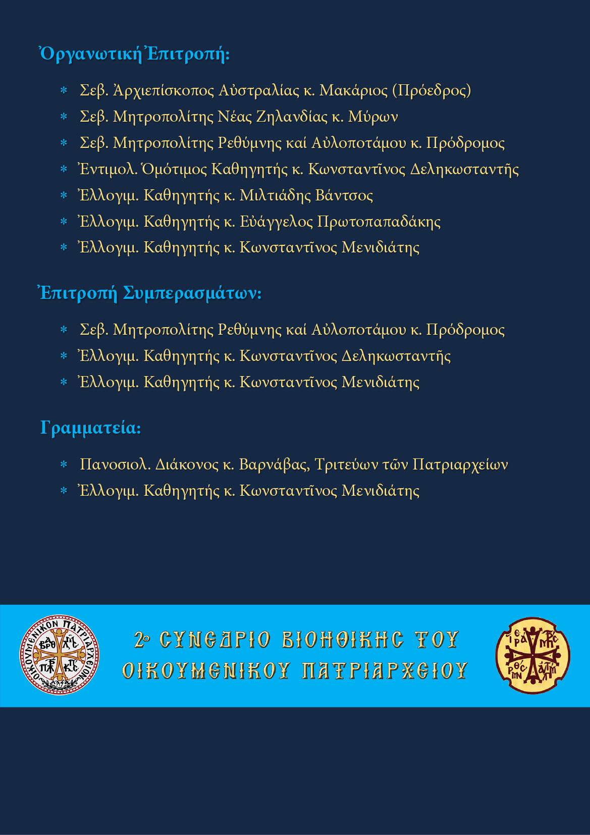 Παρατίθεται η πρόσκληση του Σεβασμιωτάτου Αρχιεπισκόπου Αυστραλίας κ. Μακαρίου, Προέδρου της Συνοδικής Επιτροπής Βιοηθικής του Οικουμενικού Πατριαρχείου, καθώς και το αναλυτικό Πρόγραμμα του εν λόγω Επιστημονικού και Θεολογικού Συνεδρίου.
