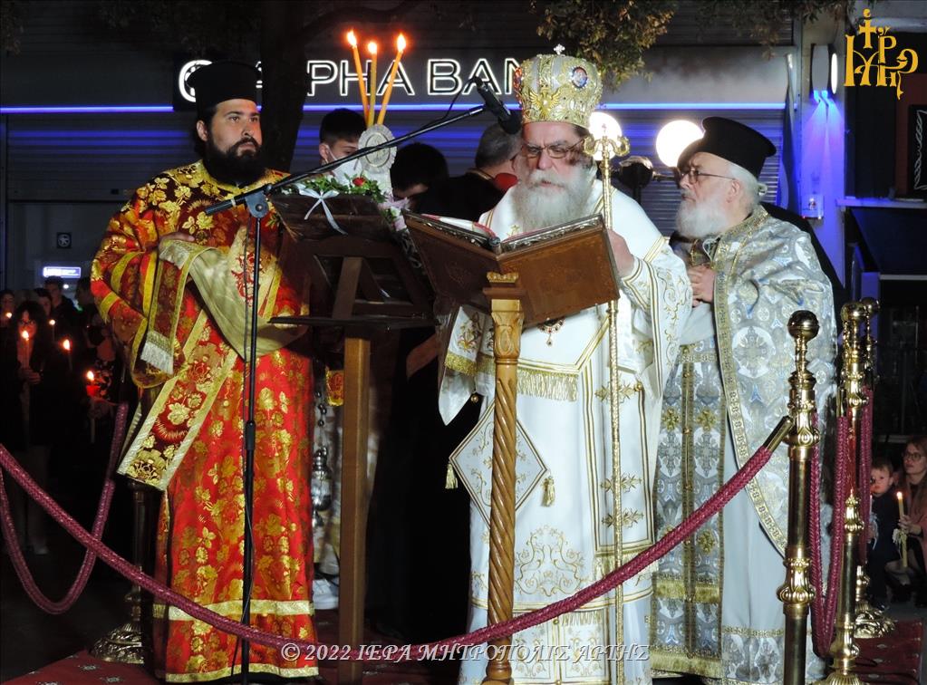 Τα μεσάνυχτα πραγματοποιήθηκε η Τελετή της Αναστάσεως, η Ιερά Ακολουθία του Όρθρου και η Αναστάσιμη Θεία Λειτουργία, στο τέλος της οποίας ο Σεβασμιώτατος μοίρασε κόκκινα αυγά στους πιστούς.