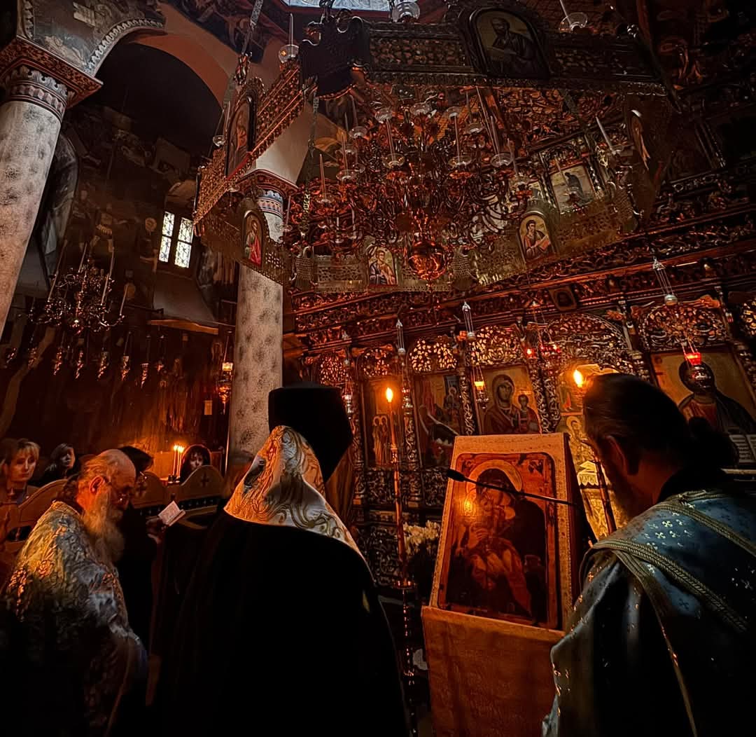 Ὁ Σεβασμιώτατος χοροστάτησε στὴν ἀκολουθία τοῦ Μικροῦ Ἀποδείπνου καὶ τῆς Γ’ Στάσεως τῶν Χαιρετισμῶν πρὸς τὴν Ὑπεραγία Θεοτόκο, πλαισιούμενος ἀπὸ τὸν ἐφημέριο ἱερέα π. Ἠλία καὶ τὸν διάκονο π. Νικόδημο, τὴν Ἡγουμένη Γερόντισσα Ἐφραιμία καὶ τίς μοναχὲς καὶ τοὺς πολλοὺς προσκυνητές.