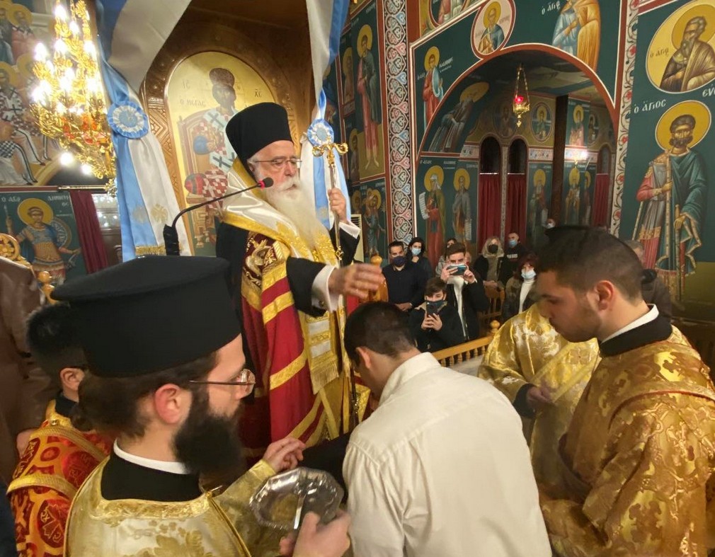 Στον Πανηγυρίζοντα Ιερό Ναό Αγίου Σπυρίδωνος Ν. Ιωνίας χοροστάτησε ο Σεβ. Μητροπολίτης Δημητριάδος, κατά τον Μέγα Πανηγυρικό Εσπερινό της εορτής, παρουσία πλήθους ευλαβών προσκυνητών. Κατά την διάρκεια το Εσπερινού, ο Σεβασμιώτατος προεχείρησε σε Αναγνώστη τον κ. Ευστάθιο Γλάρο, μαθητή της 2ας Εσπερινού Λυκείου, ο οποίος κατά τις πρωινές ώρες της ημέρας εργάζεται, προκειμένου να βοηθήσει οικονομικώς την οικογένειά του, γεγονός που ο Ποιμενάρχης μας ιδιαιτέρως εκτίμησε και επαίνεσε, ενώ ασχολείται και με το άθλημα της Πάλης. Ο Σεβασμιώτατος αναφέρθηκε στον θεσμό των Αναγνωστών, την ποιμαντική ευθύνη των οποίων αναλαμβάνει ο εκάστοτε Αρχιδιάκονος και από τους οποίους, μέχρι σήμερα, προήλθε πλήθος ευλαβών Κληρικών μας: «Είναι πολύ σημαντικό για τον Επίσκοπο», επεσήμανε ο Σεβασμιώτατος, «να εισαγάγει στην ιερωσύνη αξίους Κληρικούς, αγάμους και εγγάμους, που διακρίνονται από αγάπη για τον Χριστό και γνωρίζουν την θέση τους μέσα στην Εκκλησία, συνεχίζοντας το έργο που μας ανέθεσε ο Χριστός… Μας προξενεί μεγάλη χαρά το γεγονός ότι σ΄ αυτή την τόσο εκκοσμικευμένη εποχή μας, καμαρώνουμε αυτά τα ιδιαίτερα διαμάντια, που θυμίζουν τους τρεις παίδες στο καμίνι της φωτιάς, που δεν κάηκαν. Οι νέοι μας ζουν μέσα στην φωτιά της κοινωνίας μας κι όμως δεν καίγονται, διότι, κάτω απ’ το πετραχήλι του Πνευματικού και με την μεταξύ τους ενότητα, κρατούν την αγνότητα και την αγωνιστικότητά τους, βαδίζοντας στα χνάρια των Αγίων».