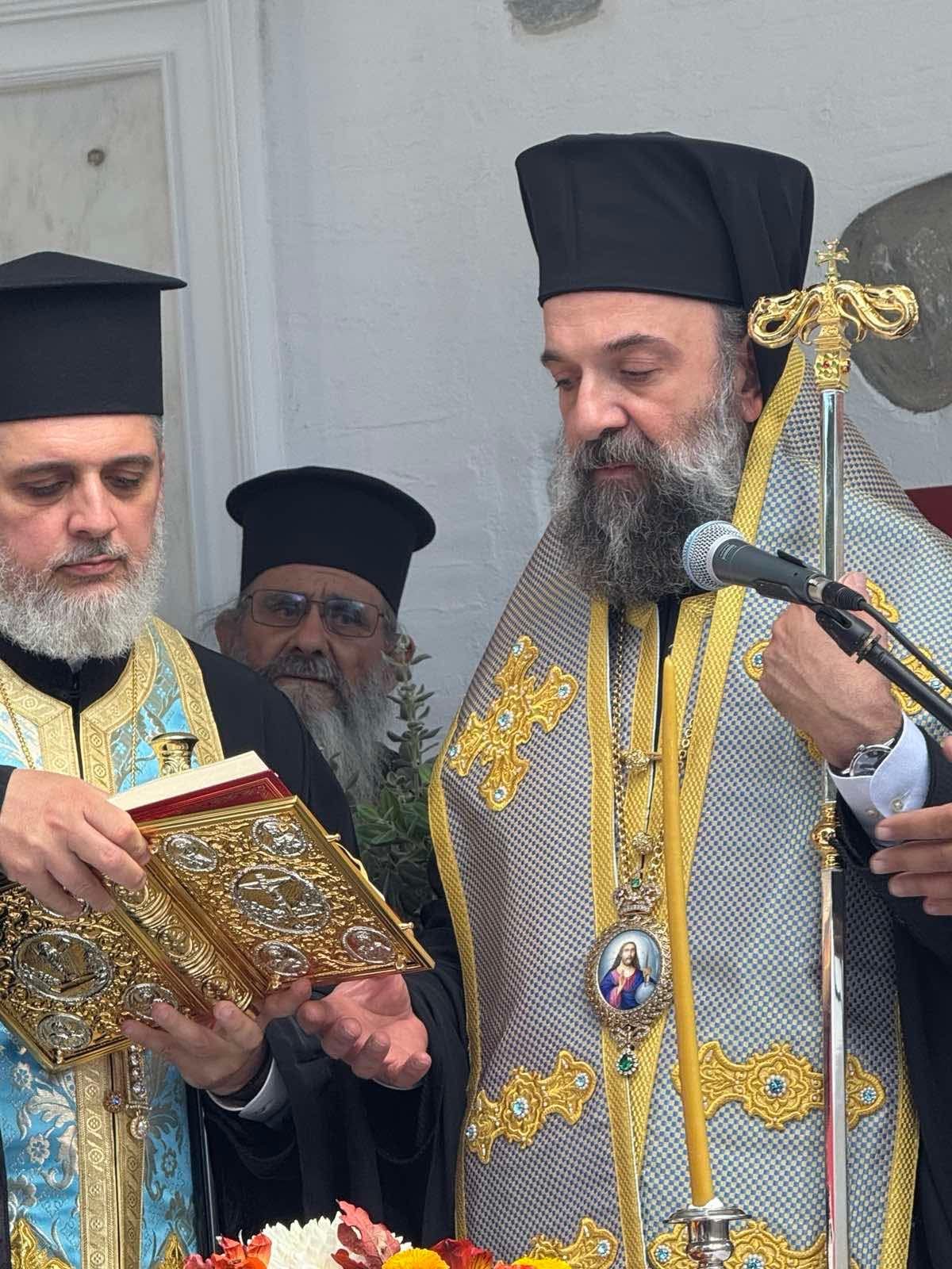 Μετά την τέλεση του Αγιασμού, ο Σεβασμιώτατος απηύθυνε χαιρετισμό, υπογραμμίζοντας την αξία της Παιδείας ως θεμελίου της κοινωνίας και ως καρπού του φωτισμού του Αγίου Πνεύματος. Επεσήμανε ότι «η Δημοτική Βιβλιοθήκη Αμοργού έρχεται ως συνέχεια και επισφράγιση του φιλερεύνου πνεύματος των Αμοργίνων, οι οποίοι στο διάβα των αιώνων, ως φιλομαθείς και εμβριθείς μελετητές, κατέλιπαν αξιόλογα έργα τέχνης, ιστορίας και πολιτισμού». Ανέφερε επίσης ότι «η Εκκλησία μας, η οποία διαχρονικά στέκεται στο πλευρό κάθε πνευματικής και μορφωτικής προσπάθειας, ευλογεί και προσεύχεται η νέα αυτή βιβλιοθήκη να καταστεί χώρος δημιουργίας και καλλιέργειας, φάρος φωτεινός μέσα στον σύγχρονο κόσμο της ταχύτητας και της πληροφορίας» και ευχαρίστησε τον Πρόεδρο και τα Μέλη της Ελληνικής Κυβερνήσεως για την παρουσία τους στο νησί.