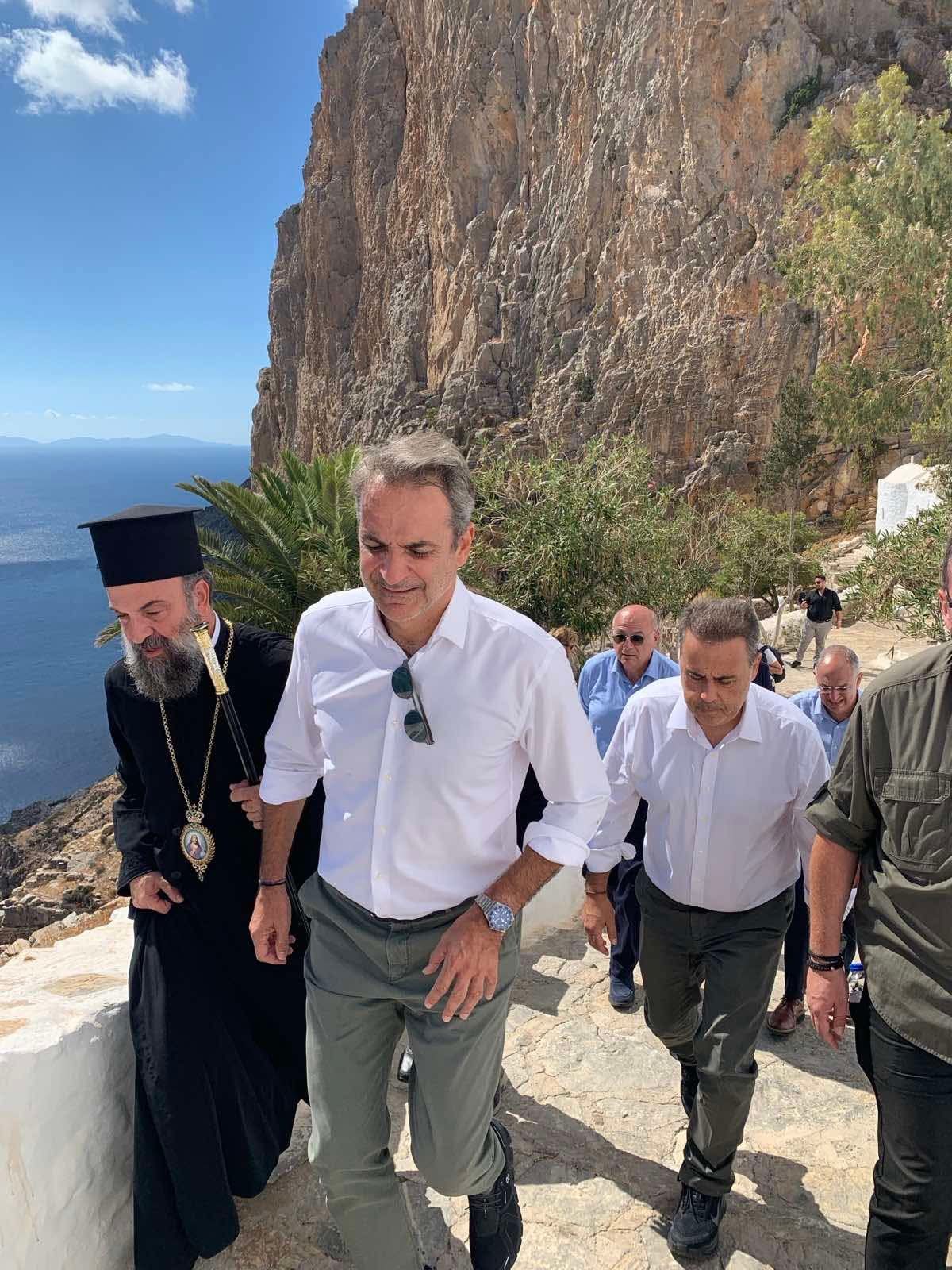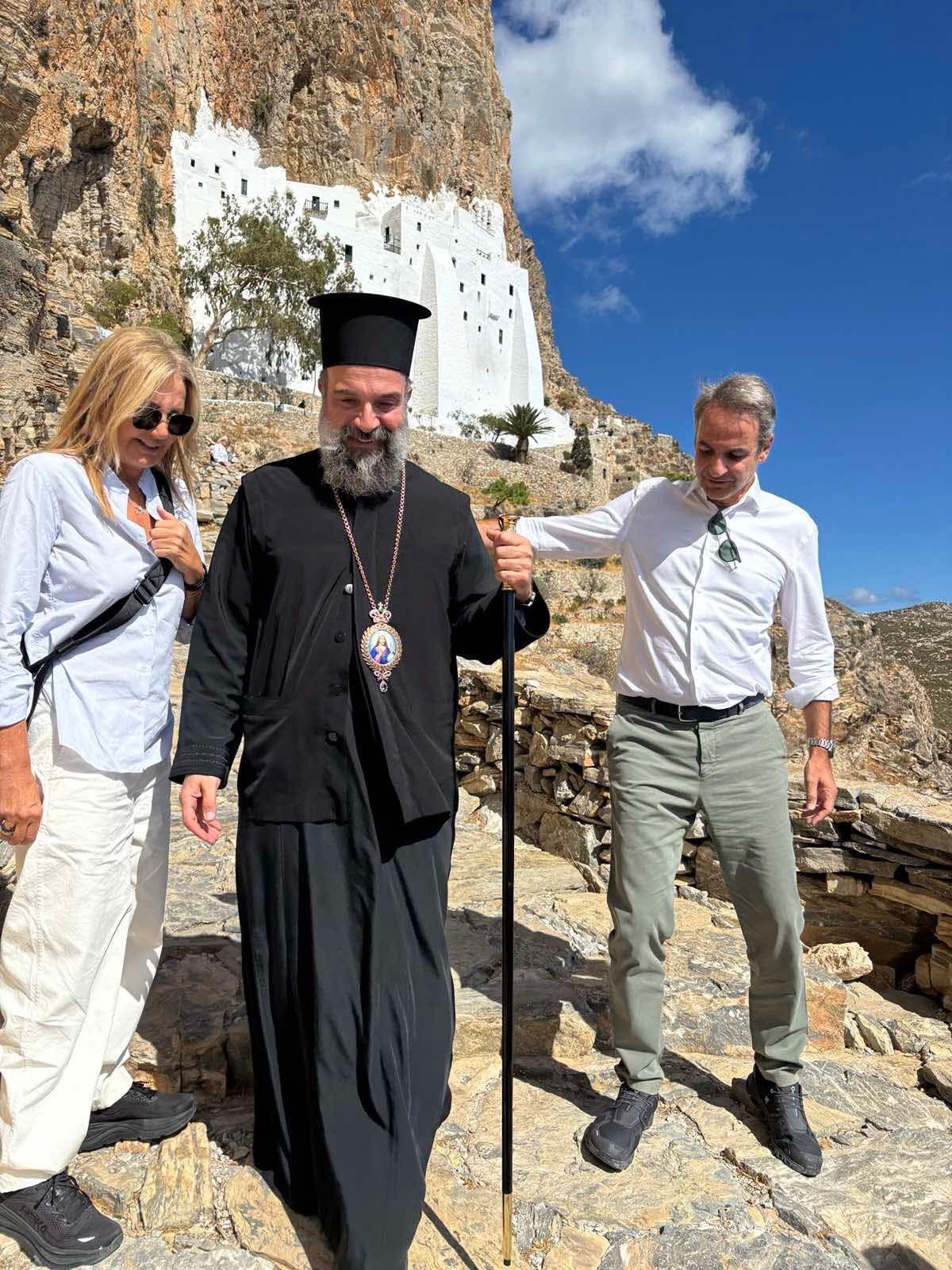 Ο Μητροπολίτης και ο Πρωθυπουργός με τη συνοδεία του επισκέφθηκαν την Ιερά Μονή Παναγίας της Χοζοβιωτίσσης, το καύχημα της Αμοργού και ιερό προσκύνημα με ιστορία αιώνων. Εκεί, αφού έγιναν δεκτοί με την αρμόζουσα εκκλησιαστική τάξη και τις πρέπουσες τιμές, προσκύνησαν ευλαβώς την θαυματουργό εικόνα της Παναγίας της Χοζοβιωτίσσης, εκζητώντας την χάρη και την ευλογία της Υπεραγίας Θεοτόκου.