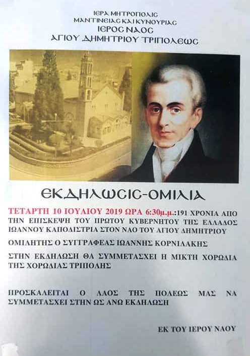 Ἡ Ἱερά Μητρόπολις Μαντινείας καί Κυνουρίας καί ὁ ἐνορίακός Ἱερός Ναός Ἁγίου Δημητρίου Τριπόλεως διοργάνωσαν τήν Τετάρτη 10 Ἰουλίου 2019 ἐκδήλωση για τήν ἐπέτειo τῆς συμπληρώσεως 191ἐτών ἀπό τήν ἐπίσκεψη τοῦ πρώτου Κυβερνήτου τῆς Ἑλλάδος Ἰωάννου Καποδίστρια στό Ναόκαί τήν συμβολή του στήν ἐπανοικοδόμηση του.
