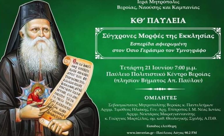 Στο πλαίσιο των «ΚΘ’ Παυλείων» την Τετάρτη 21 Ιουνίου στις 7:00 μ.μ. στο Παύλειο Πολιτιστικό Κέντρο Βεροίας (πλησίον Βήματος Απ. Παύλου) θα πραγματοποιηθεί η καθιερωμένη εσπερίδα «Σύγχρονες Μορφές της Εκκλησίας», η οποία φέτος είναι αφιερωμένη στον νέο Άγιο της Εκκλησίας μας, Γεράσιμο τον Υμνογράφο.Στην εκδήλωση θα ομιλήσει ο Ποιμενάρχης μας, Σεβασμιώτατος Μητροπολίτης Βεροίας, Ναούσης και Καμπανίας κ. Παντελεήμων, ο Γενικός Αρχιερατικός Επίτροπος της Ιεράς Μητροπόλεως Νέας Ιωνίας Αρχιμ. Τιμόθεος Ηλιάκης, ο Αρχιμ. Νεκτάριος Μικραγιαννανίτης και ο ομ. Καθηγητής της Θεολογικής Σχολής του Α.Π.Θ. κ. Γεώργιος Μαρτζέλος, οι οποίοι θα αναφερθούν στον θαυμαστό βίο, το υμνογραφικό χάρισμα και στις προσωπικές τους εμπειρίες από τον Όσιο Γεράσιμο.