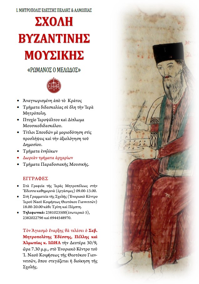 Άρχισαν οι εγγραφές στην Σχολή Βυζαντινής Μουσικής της Ιεράς Μητροπόλεως Εδέσσης, Πέλλης και Αλμωπίας για το νέο διδακτικό έτος 2019-20.