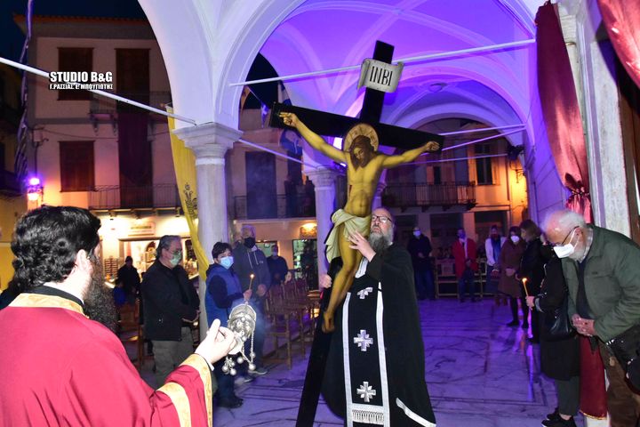 Σε κλίμα κατάνυξης τελέσθηκε η ακολουθία του Εσταυρωμένου και του όρθρου της Μεγάλης Παρασκευής στον Μητροπολιτικό Ιερό ναό του Αγίου Γεωργίου στο Ναύπλιο την Μεγάλη Πέμπτη 21 Απριλίου 2022. Την ακολουθία τέλεσε ο εφημέριος του ναού πρωτοπρεσβύτερος π. Παναγιώτης Κιντής ,ενώ καθόλη την ακολουθία έψαλλε ο μητροπολίτης Αργολίδας Νεκτάριος .Η Μεγάλη Εβδομάδα αρχίζει από την Κυριακή των Βαΐων το βράδυ, όπου τελείται η Ακολουθία του Νυμφίου, και τελειώνει το Μεγάλο Σάββατο και είναι αφιερωμένη στα Άγια Πάθη του Ιησού Χριστού. Ονομάζεται Μεγάλη από την ανάμνηση των γεγονότων που διαδραματίζονται καθ’ εκάστη των ημερών αυτής τα οποία και θεωρούνται ιδιαίτερα σημαντικά για τη χριστιανική θρησκεία.