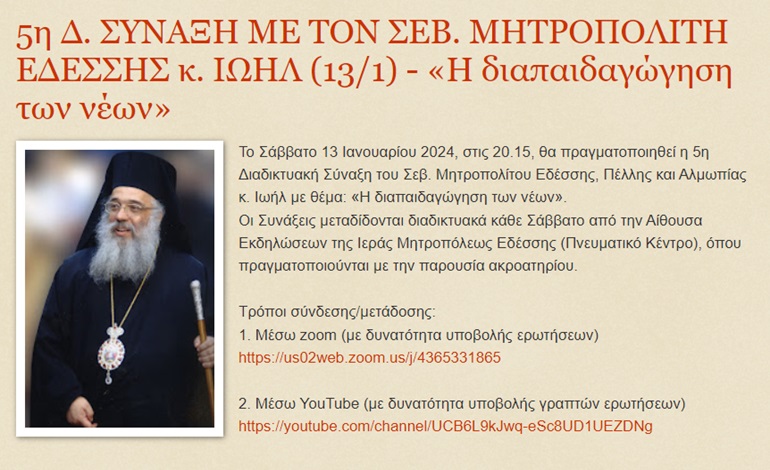 Το Σάββατο 13 Ιανουαρίου 2024, στις 20.15, θα πραγματοποιηθεί η 5η Διαδικτυακή Σύναξη του Σεβ. Μητροπολίτου Εδέσσης, Πέλλης και Αλμωπίας κ. Ιωήλ με θέμα: «Η διαπαιδαγώγηση των νέων».