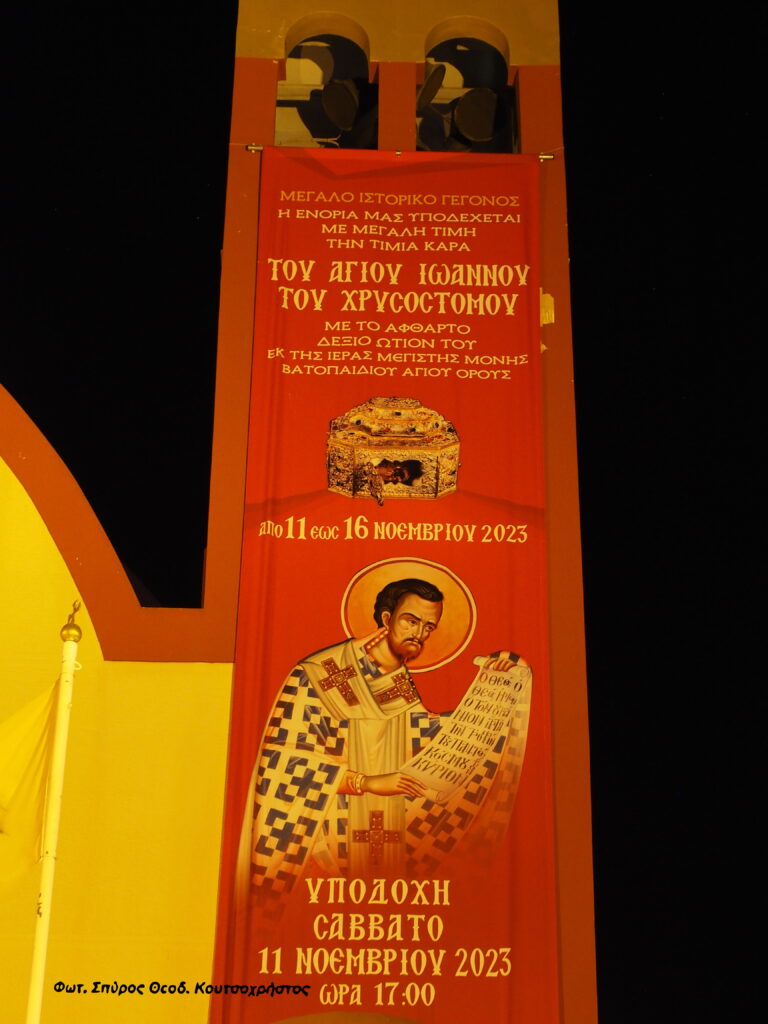 Ένα πνευματικό και ιστορικό γεγονός θα λάβει χώρα στον Ιερό Ενοριακό Ναό ΑγίουΕλευθερίου οδού Αχαρνών – Αθηνών, με την ευλογία του Μακαριωτάτου Αρχιεπισκόπου Αθηνών & πάσης Ελλάδος κ.κ. Ιερωνύμου του Β΄, από το Σάββατο 11 Νοεμβρίου ( ώρα 17:00 )έως και την Πέμπτη ( ώρα 10:00 ) 16 Νοεμβρίου 2023.Η  Τιμία, χαριτόβρυτος και θαυματουργός  Κάρα του Αγίου Ιωάννου του Χρυσοστόμου,με αναλλοίωτο το δεξιό ωτίο του, που αποθυσαυρίζεται στην Ιερά Μεγίστη Μονή ΒατοπαιδίουΑγίου Όρους,έρχεται για πρώτη φορά στην Αθήνα, 1617 χρόνια από την κοίμησή του.Πριν από την είσοδο του  Ιερού Ναού, δίπλα από την σκάλα ( δεξιά & αριστερά),  βρίσκονταιτα περικλή Προσκυνητάρια, των Αγίων Αγιορειτών Πατέρων & των Αγίων Πορφυρίου και Παϊσίου.Η προτομή του μακαριστού Πρωτοπρεσβυτέρου π. Κωνσταντίνου Παναγιωτόπουλου ( 1931  – 2023 )” καλοσορίζει ” στους πιστούς στον Οίκο του Θεού, καθώς είναι ο κτήτωρ, ο πρώτος Εφημέριος και διακονητής  του ” Αγίου Ελευθερίου οδού Αχαρνών “, επί 61 ολόκληρα χρόνια.Η επίσημη υποδοχή της Τιμίας Κάρας , θα γίνει το Σάββατο 11 Νοεμβρίου 2023 και ώρα  17:00.Ο Ιερός Ναός θα είναι ανοικτός όλο το 24ωρο, θα τελούνται καθημερινά,  Θεία Λειτουργία στις 07:00 , Ιερές Ακολουθίες και στις 21:30 Ιερά Αγρυπνία.