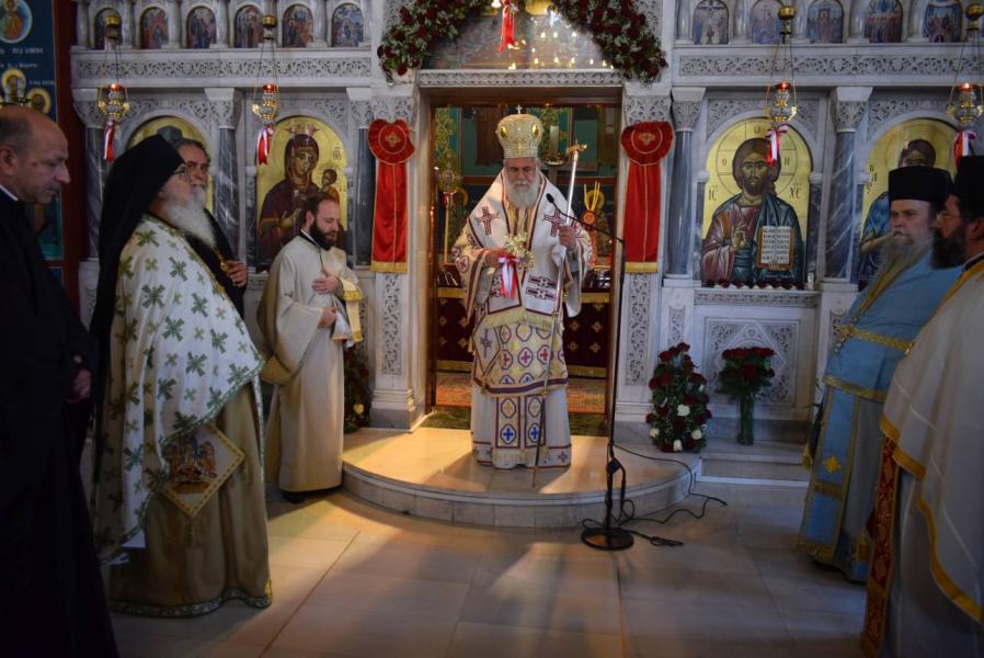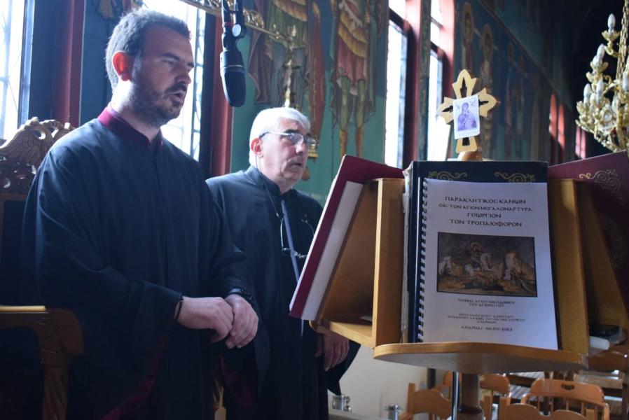 Πριν το τέλος της Θείας Λειτουργίας και αφού τελέστηκε η ακολουθία της αρτοκλασίας και η ευλογία των κολύβων του Αγίου, ο Σεβασμιώτατος αναφέρθηκε στον στίχο του απολυτικίου της Μεσοπεντηκοστής «Μεσούσης τῆς ἑορτῆς, διψῶσάν μου τὴν ψυχήν, εὐσεβείας πότισον νάματα», τονίζοντας ότι τα νάματα που αναφέρονται δεν είναι μόνο τα σωτήρια λόγια του Χριστού και του Ευαγγελίου Του, αλλά και η βίωσή τους μέσω της Θείας Ευχαριστίας, που τροφοδοτεί τον άνθρωπο και τον οδηγεί στη σωτηρία του. Ο Άγιος Γεώργιος, του οποίου τα λείψανα προσκυνούμε, είναι ζωντανή έκφραση αυτής της πραγματικότητας, αφού την επιβεβαίωσε με το μαρτύριό του.