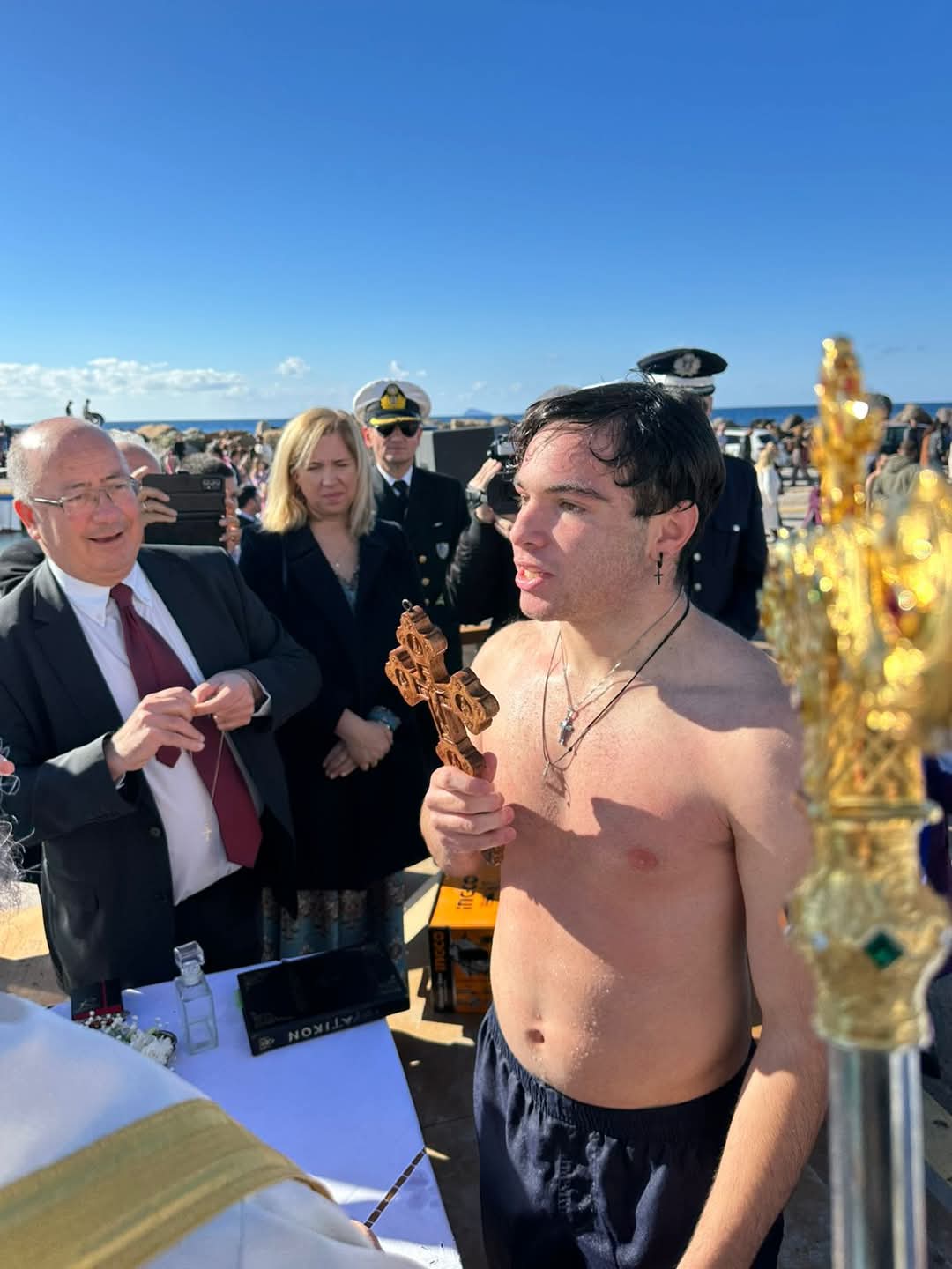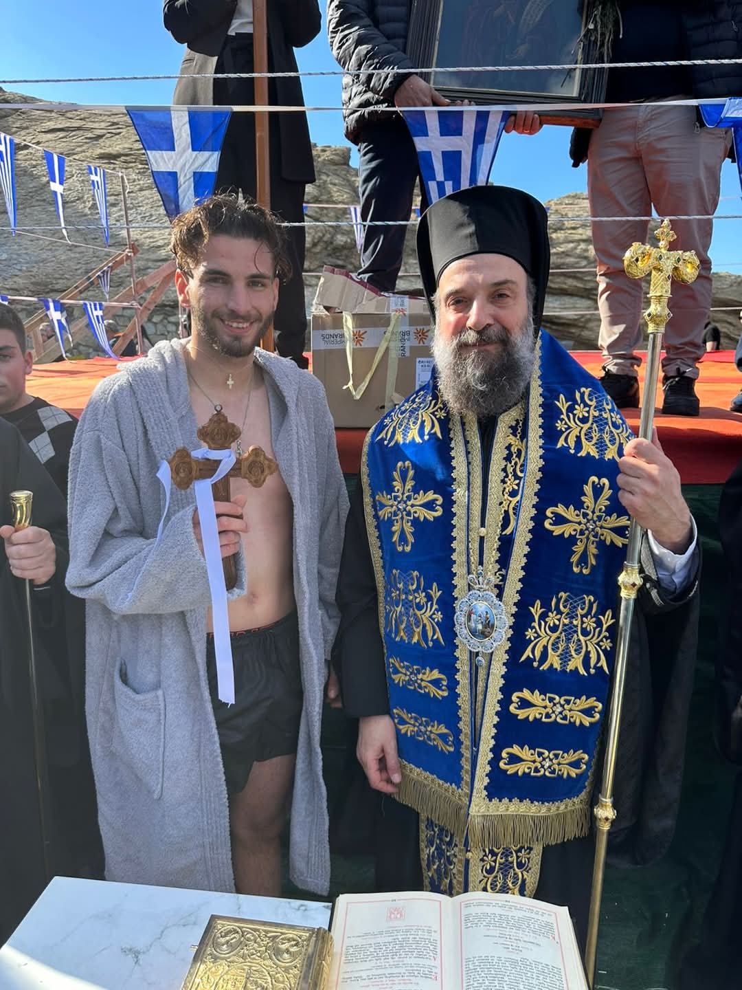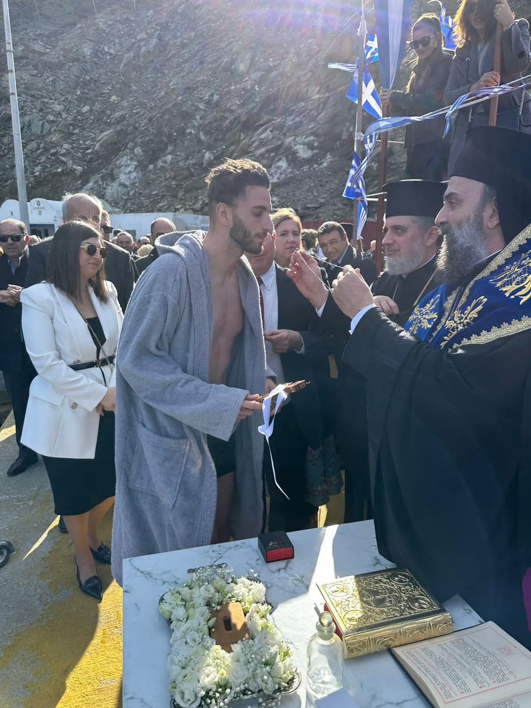Αρκετοί ήταν οι κολυμβητές που με σύμμαχο τον καλό καιρό βούτηξαν στα καταγάλανα νερά της Σαντορίνης για να ανασύρουν τον Τίμιο Σταυρό και να λάβουν την ευλογία Του. Σε αυτούς μάλιστα που κατάφεραν να Τον ανασύρουν από τη θάλασσα, ο Σεβασμιώτατος προσέφερε ως ευλογία από έναν σταυρό.