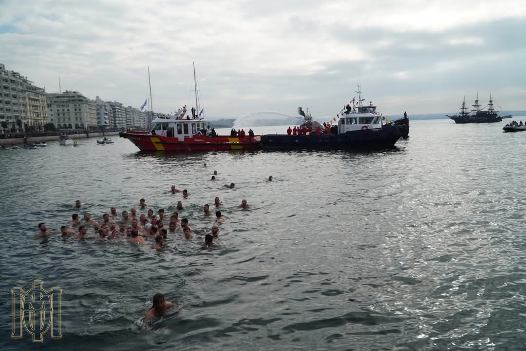 Πενήντα σχεδόν κολυμβητές και κολυμβήτριες έπεσαν στα νερά του Θερμαϊκού για τον Τίμιο Σταυρό, τον οποίο έπιασε ο 25χρονος κ. Μάρκος Αναστασόπουλος από την Πάτρα, στον οποίον ο Παναγιώτατος προσέφερε ένα χρυσό Σταυρό, ενώ στους υπολοίπους κολυμβητές και κολυμβήτριες ένα αργυρό. Ιδιαίτερα συγκινητική η συμμετοχή ενός εντεκάχρονου μαθητή, του Αντώνη, ο οποίος έπεσε στα παγωμένα νερά ως «τάμα».