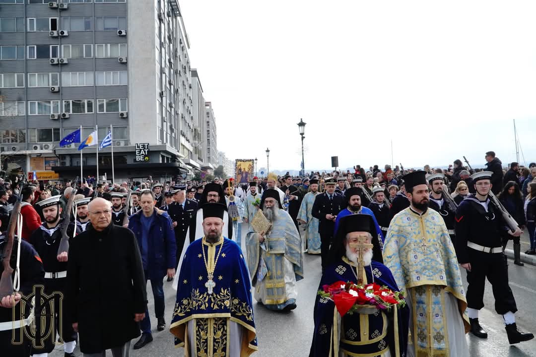 Η ιερά πομπή, στην οποία συμμετείχαν χιλιάδες πιστών Θεσσαλονικέων, αλλά και επισκεπτών της Πόλης, κατευθύνθηκε μέσω της παραλιακής Λεωφόρου Νίκης στο Λιμάνι Θεσσαλονίκης, όπου στον Α΄ προβλήτα ετελέσθη η καθιερωμένη Ακολουθία του Καθαγιασμού των Υδάτων.