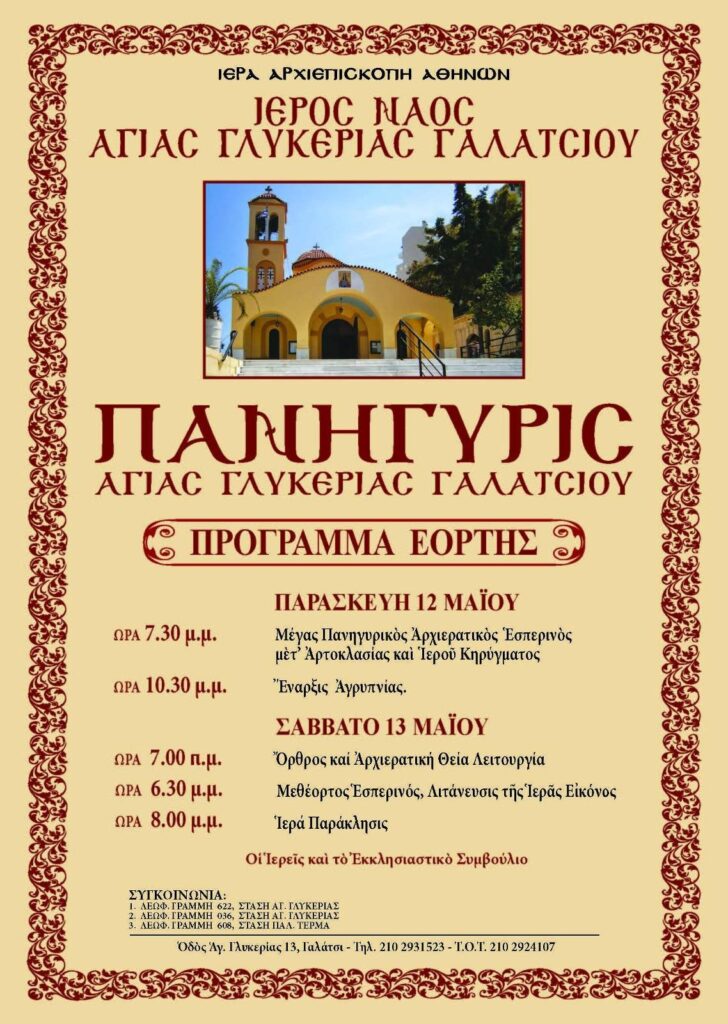 Πανηγυρίζει την 12η και 13η Μαϊου ο Ιερός Ναός Αγίας Γλυκερίας της παρθενομάρτυρος, μυροβλύτιδος και θαυματουργού, πολιούχου Γαλατσίου. Οι πανηγυρικές εορταστικές εκδηλώσεις θα διεξαχθούν σύμφωνα με το συνημμένο πρόγραμμα.