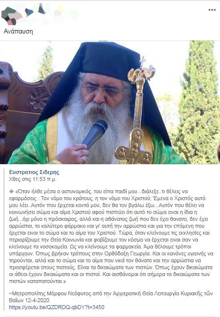 «Όταν ήλθε μέσα ο αστυνομικός, του είπα παιδί μου…διάλεξε..τι θέλεις να εφαρμόσεις. Τον νόμο του κράτους, η τον νόμο του Χριστού; Έμενα ο Χριστός αυτό μου λέει… Αυτόν που έρχεται κοντά μου, δεν θα τον βγάλω έξω… Αυτόν που θέλει να κοινωνήσει σώμα και αίμα Χριστού αφού πιστεύει ότι αυτό το σώμα είναι η ίδια η ζωή… όχι μόνο η πρόσκαιρος, αλλά και η αθάνατος ζωή που δεν έχει θάνατο, δεν έχει αρρώστια, το καλύτερο φάρμακο και γι’ αυτή την αρρώστια και για την επόμενη που έρχεται είναι το σώμα και το αίμα του Χριστού.