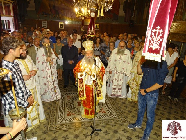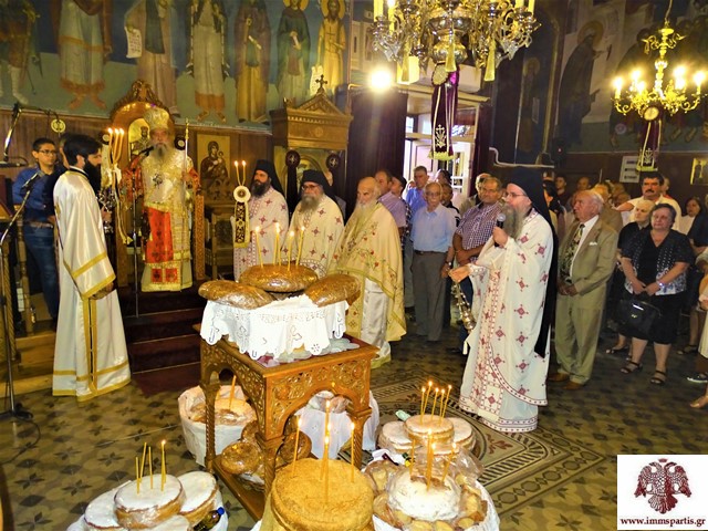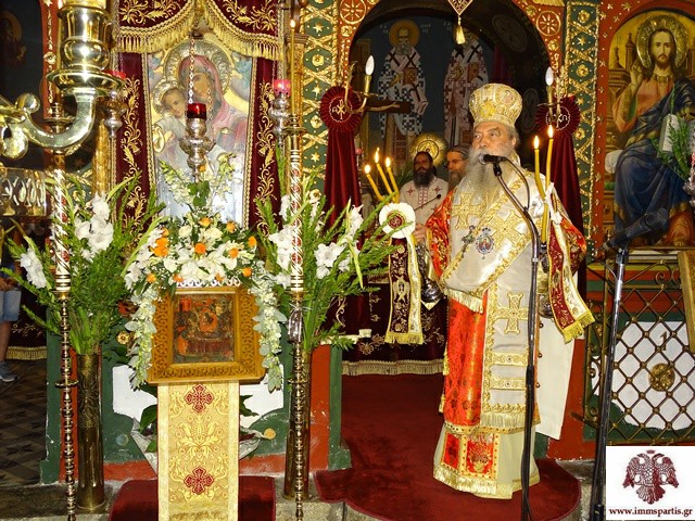 Στην μελίρρυτη ομιλία του, ο Σεβασμιώτατος αναφέρθηκε στην τιμώμενη Υπεραγία Θεοτόκο. Μεταξύ άλλων μίλησε για τα πέντε γράμματα του ονόματος της Παναγίας, που ήταν Μαρία, εξηγώντας ότι προέρχονται από τη Μαριάμ, την αδελφή του Μωυσή, την προφήτιδα Άννα, μητέρα του Σαμουήλ, την ωραιότατη Ραχήλ, σύζυγο του Πατριάρχου Ιακώβ, την αδρεία Ιουδείθ και τη φρόνιμο Αβιγαία, η οποία για την καλοσύνη της και τη σύνεσή της αξιώθηκε να γίνει σύζυγος του Δαυίδ. Ο Σεβασμιώτατος επισήμανε ότι οι αρετές αυτών των γυναικών και ακόμα περισσότερες συγκεντρώνονται στο πρόσωπο της Μεγαλόχαρης, η οποία πάντα μας καθοδηγεί, μας ενισχύει και μεσιτεύει για τη σωτηρία μας.