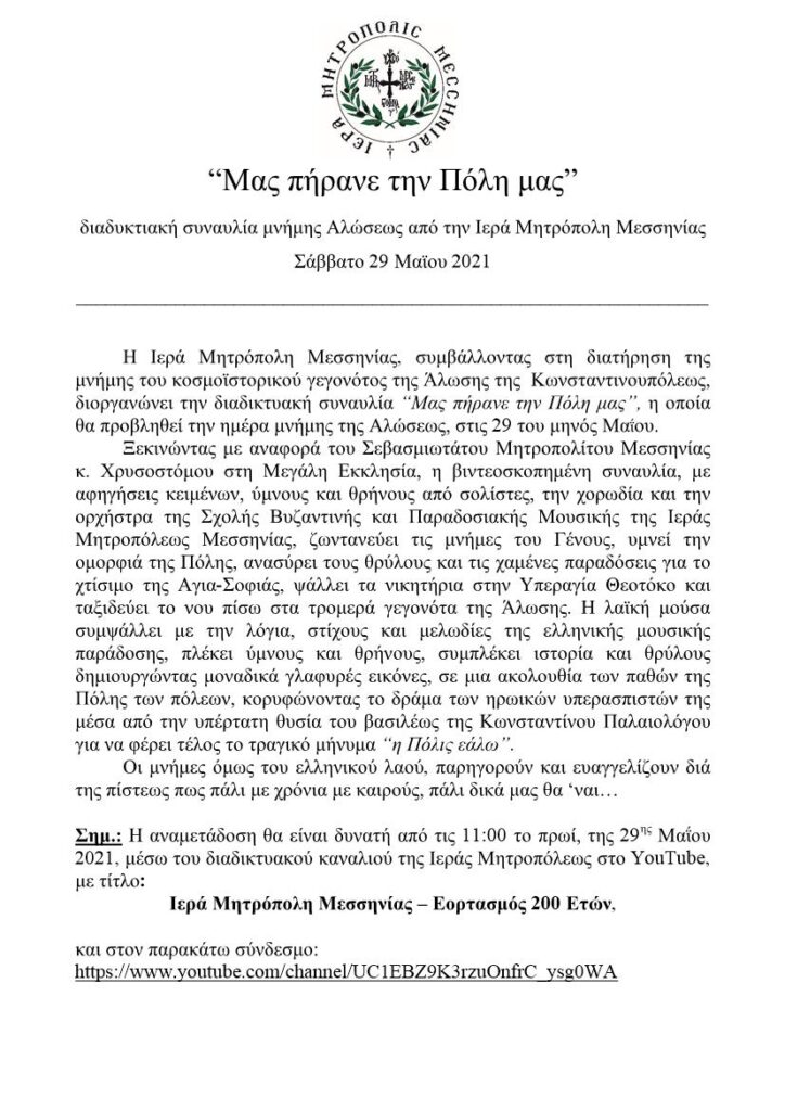 “Λαμπρά Πανήγυρις της Πολιούχου του Αιγίου Ζωοδόχου Πηγής – Παναγίας Τρυπητής”