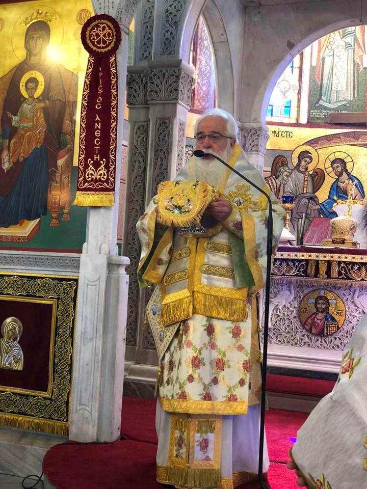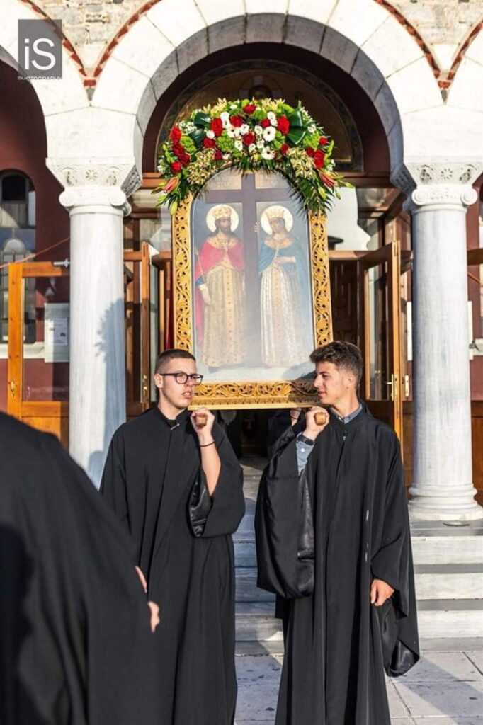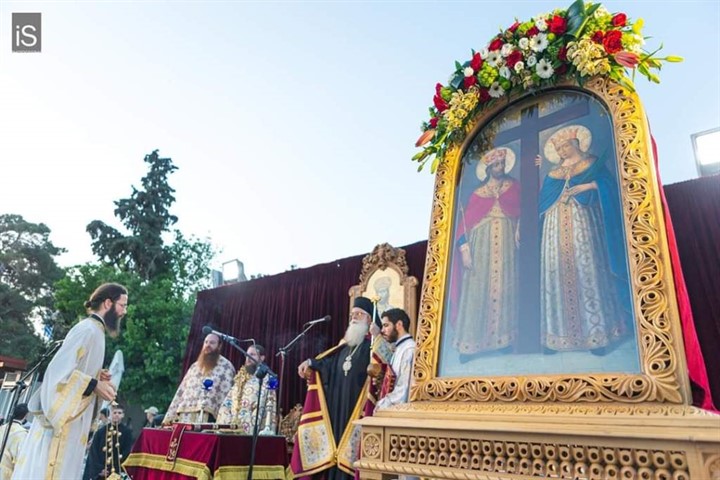 Στην ομιλία του ο Σεβασμιώτατος τόνισε ότι «η τιμή των Αγίων μας φέρει στο νου μας τον Τίμιο Σταυρό, αλλά και τον Ίδιο τον Εσταυρωμένο και Αναστάντα Ιησού Χριστό. Ο Μέγας Κωνσταντίνος ήταν εκείνος που έλαβε το μήνυμα του ουρανού, έκανε τον Σταυρό σύμβολο του Βασιλείου και πίστεψε στον Χριστό ως τον μόνο αληθινό Θεό. Ενώ η μητέρα του Ελένη, προσκυνήτρια ούσα στους Αγίους Τόπους, έζησε την μεγάλη χαρά να φέρει στο φως τον Τίμιο Σταυρό και να τον καταστήσει επίκεντρο της ζωής των πιστών, στήριγμα και σωτηρία του λαού. Γι’ αυτό, στην εικόνα των Αγίων δεσπόζει ο Σταυρός του Κυρίου, γιατί η Εκκλησία θέλει να μας θυμίζει ότι καλούμαστε σε πορεία Σταυρώσιμη και Αναστάσιμη, μια πορεία με προορισμό τον ουρανό, που ανοίγεται, όμως, διαρκώς στον κάθε άλλο, γιατί δεν μπορεί να υπάρξει πίστη στον αληθινό Θεό, χωρίς έμπρακτη αγάπη στον αδελφό, που είναι η ζωντανή εικόνα του Θεού. Γι’ αυτό, η κάθετη διάσταση του Σταυρού συμβολίζει την ανάγκη του ανθρώπου ν’ απευθύνεται στον ουρανό, δηλ. να συνομιλεί με τον Θεό, ενώ η οριζόντια μας θυμίζει ότι πατούμε στην γη, όπου συνυπάρχουμε με αδελφούς, τους οποίους οφείλουμε να προσεγγίζουμε με έργα αγάπης, προσφοράς και θυσίας, γιατί δεν υφίσταται πίστη προς τον Θεό, εάν δεν μεταφραστεί σε έμπρακτη αγάπη προς τον αδελφό…».