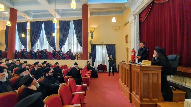 Στό δεύτερο μέρος τῆς Συνάξεως παρευρέθηκε ὁ Ἀρχιπύραρχος κ. Εὐθύμιος Γεωργακόπουλος, Διοικητής τῆς Περιφέρειας Πυροσβεστικῆς Δυτικῆς Ἑλλάδος συνοδευόμενος ἀπό τόν Διοικητή τῆς Πυροσβεστικῆς Ναυπάκτου κ. Κων. Μπέκο, μετά ἀπό πρόσκληση τοῦ Μητροπολίτου προκειμένου νά ἐνημερώση τούς Ἱερεῖς καί τούς Ἐπιτρόπους γιά θέματα καί μέτρα πυροπροστασίας, ἀτομικῆς καί ὁμαδικῆς, πού ἀφορᾶ τούς Ἱερούς Ναούς καί τίς Ἱερές Μονές.