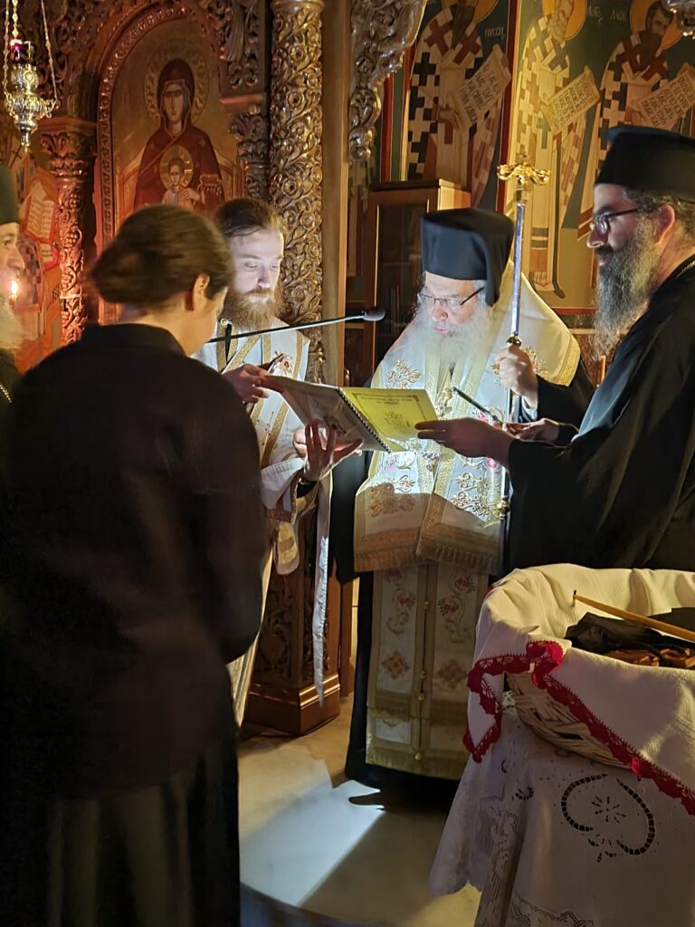 Στην σύντομη προσφώνησή του ο Σεβασμιώτατος χαρακτήρισε την χαρά της μοναχικής κουράς ως ευχάριστη ανάπαυλα στο πέλαγος της νηστείας, ανάλογη με την χαρμόσυνη παρεμβολή της ακολουθίας των Χαιρετισμών της Θεοτόκου. Συνέστησε επίσης στην νέα μοναχή να αγωνίζεται με πνευματική εγρήγορση και με την στήριξη του πνευματικού της πατρός, Αρχιμ. Παϊσίου, και της αδελφότητος.