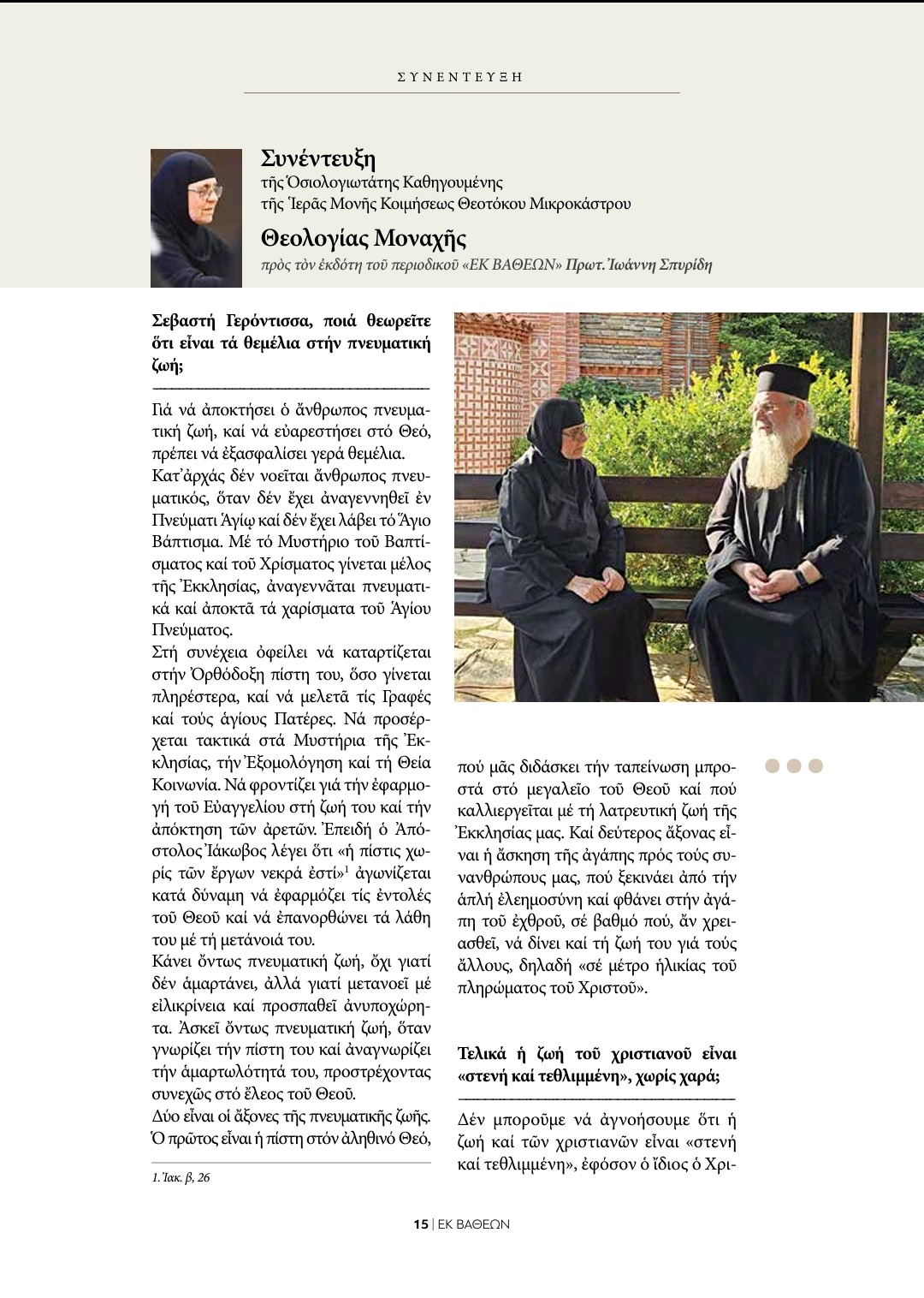 Η Οσιολογιωτάτη Καθηγουμένη της Ιεράς Μονής Κοιμήσεως Θεοτόκου Μικροκάστρου, Γερόντισσα Θεολογία, παραχωρεί συνέντευξη π. Ιωάννη Σπυρίδη.