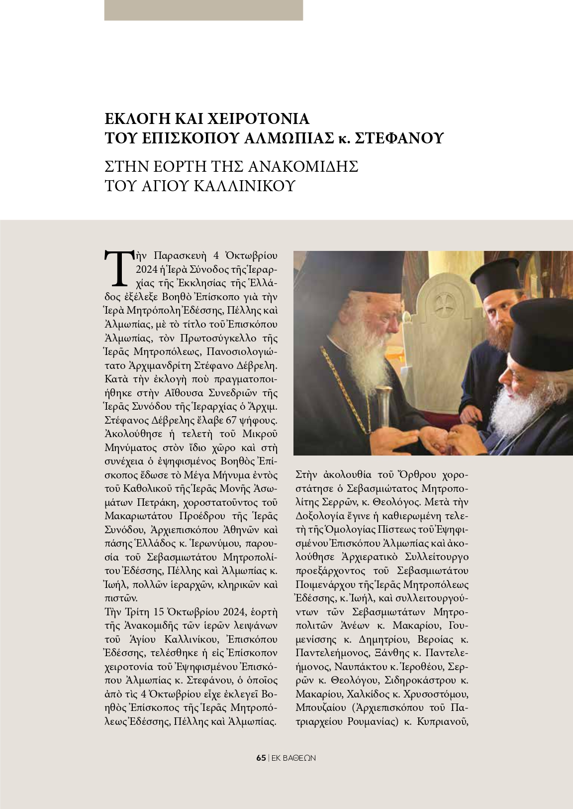Στο τέλος του περιοδικού υπάρχει ειδικό αφιέρωμα στην εκλογή και χειροτονία του Επισκόπου Αλμωπίας κ. Στεφάνου, ενώ καταγράφεται η εκκλησιαστική επικαιρότητα της Ιεράς Μητροπόλεως Εδέσσης, Πέλλης και Αλμωπίας όπως και της ενορίας Αγίου Γεωργίου Γιαννιτσών.