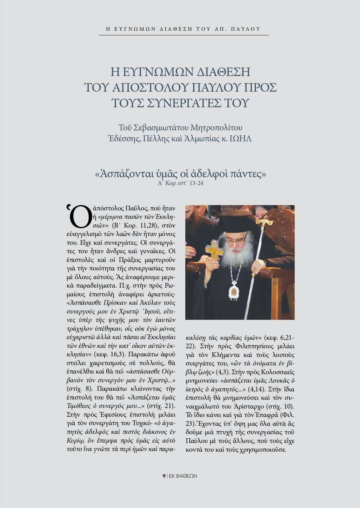 Ο Σεβασμιώτατος Ποιμενάρχης της Ιεράς Μητροπόλεως Εδέσσης, Πέλλης και Αλμωπίας κ. Ιωήλ παρουσιάζει την ευγνώμονα διάθεση του Αποστόλου Παύλου προς τους συνεργάτες του.