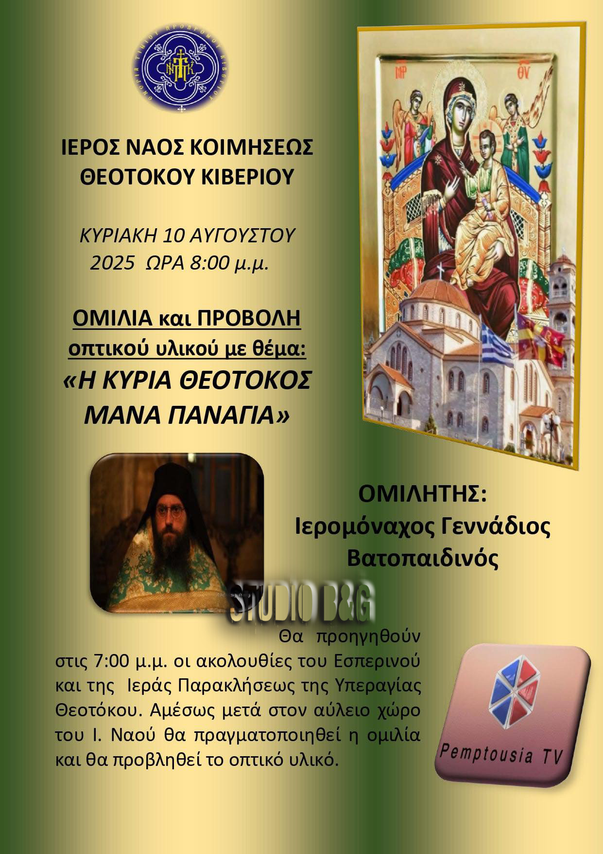 Την Κυριακή 10 Αυγούστου 2025 στον Ιερό Ναό Κοιμήσεως Θεοτόκου Κιβερίου
