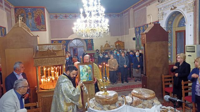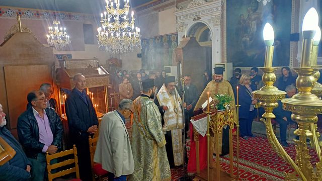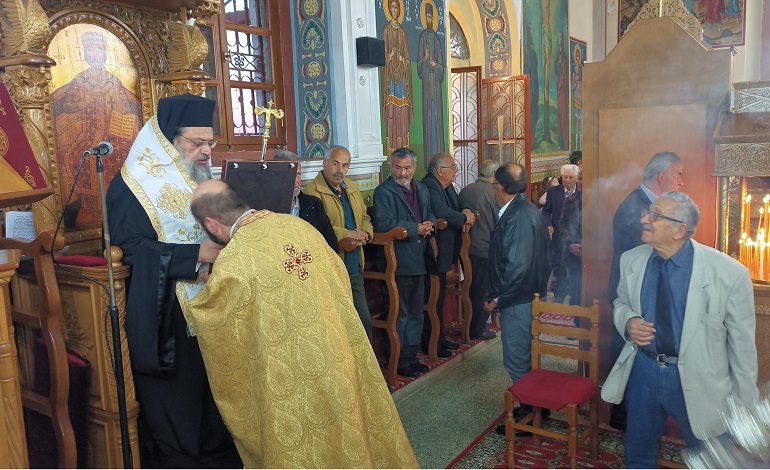 Ο Σεβασμιώτατος ανέγνωσε τη Δ’ Στάση των Χαιρετισμών ενώπιον της ιεράς εικόνος του Ευαγγελισμού της Θεοτόκου, πλαισιωμένος από τον εφημέριο του Ναού Οικον. Κυριάκο Μπακολέα και τον Διάκονο Θεόφιλο Κυριάκο, παρουσία πιστών εκ της ευρύτερης περιοχής.