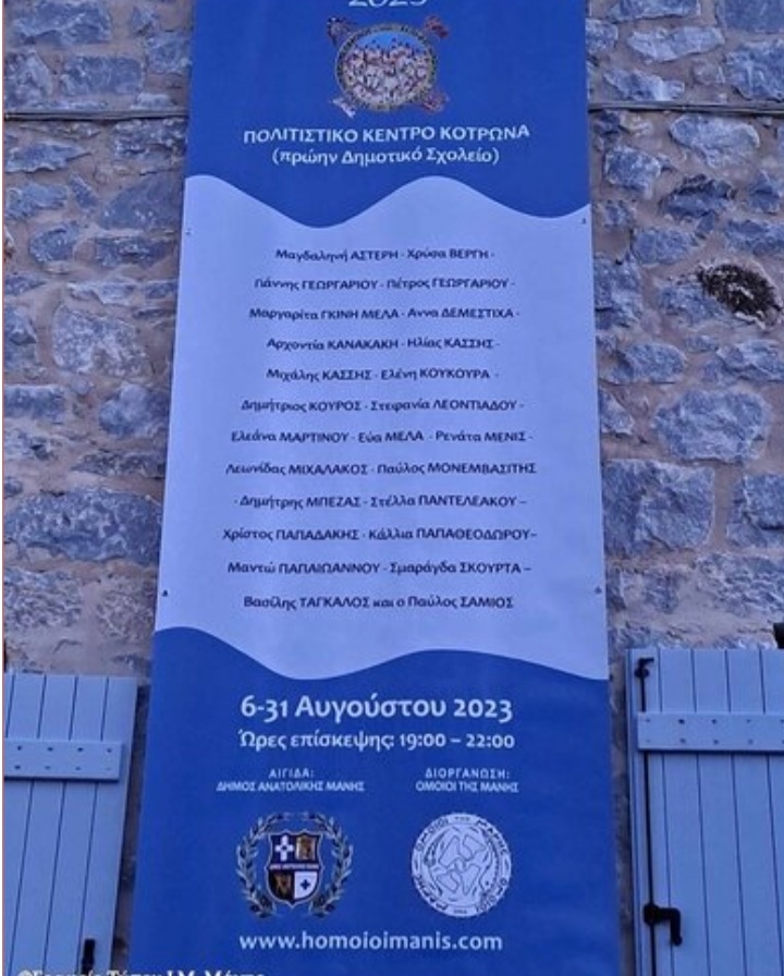 Την Κυριακή, 6/8/2023 ο Σεβ. Μητροπολίτης Μάνης κ. Χρυσόστομος Γ’, προσκληθείς από την πολιτιστική ένωση «ΟΜΟΙΟΙ ΤΗΣ ΜΑΝΗΣ», της οποίας προεδρεύει ο ομ. Καθηγητής της Ιατρικής Σχολής ΕΚΠΑ κ. Μιχ. Κουτσιλιέρης, μετέβη στον Κότρωνα, όπου και απηύθυνε χαιρετισμό στη τελετή των εγκαινίων εικαστικής τέχνης με θέμα: «Η εικόνα της Μεταμόρωσης».