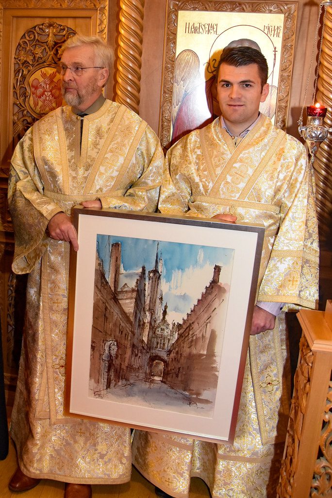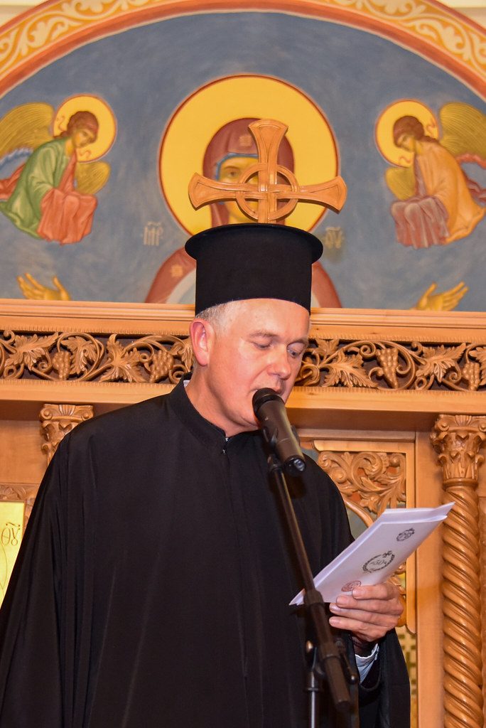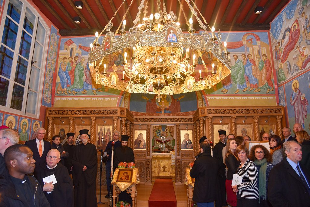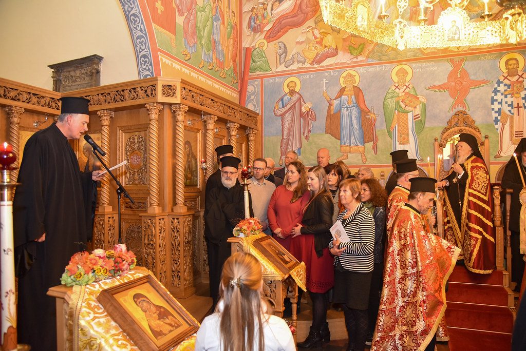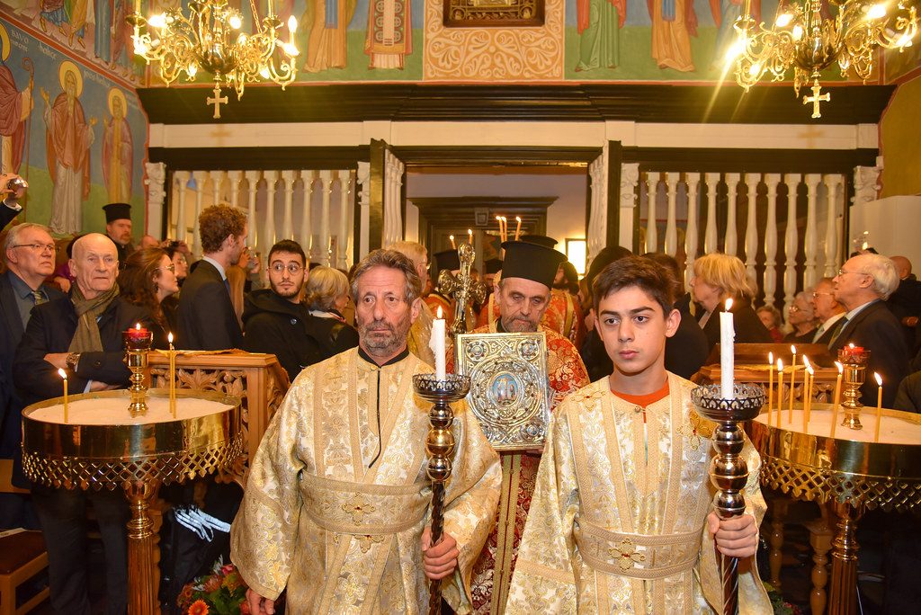 Ο Ιερατικώς Προϊστάμενος της ενορίας προσφώνησε τον Παναγιώτατο, τον καλωσόρισε, τον ευχαρίστησε γιατί μέσα στο βαρύ του πρόγραμμα ενέταξε την μικρή αλλά δυναμική ενορία της Brugge, ενώ αναφέρθηκε και στην επέτειο των τριάντα ετών διακονίας του πρώτου Εφημερίου της ενορίας και σημερινού Μητροπολίτου Βελγίου.