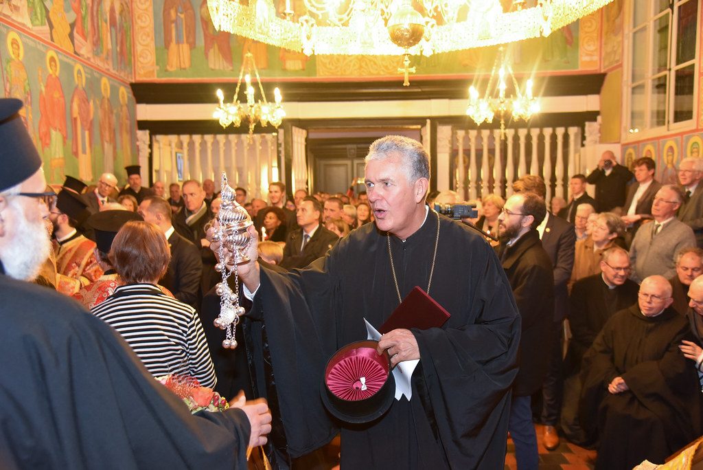 Στην συνέχεια τελέστηκε η καθιερωμένη Δοξολογία, στο τέλος της οποίας ο Παναγιώτατος ανέγνωσε Τρισάγιο για την ανάπαυση της ψυχής του αειμνήστου πατρός του Σεβασμιωτάτου και του π. Bernard, μακαριστού Πρωτοπρεσβυτέρου Ιγνατίου Peckstadt. Τους ύμνους της Υποδοχής και Δοξολογίας έψαλε η πολυφωνική χορωδία της ενορίας στα Φλαμανδικά.