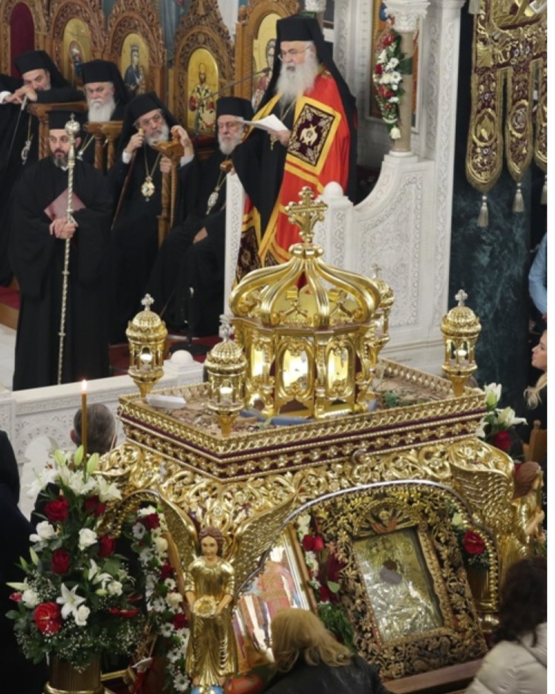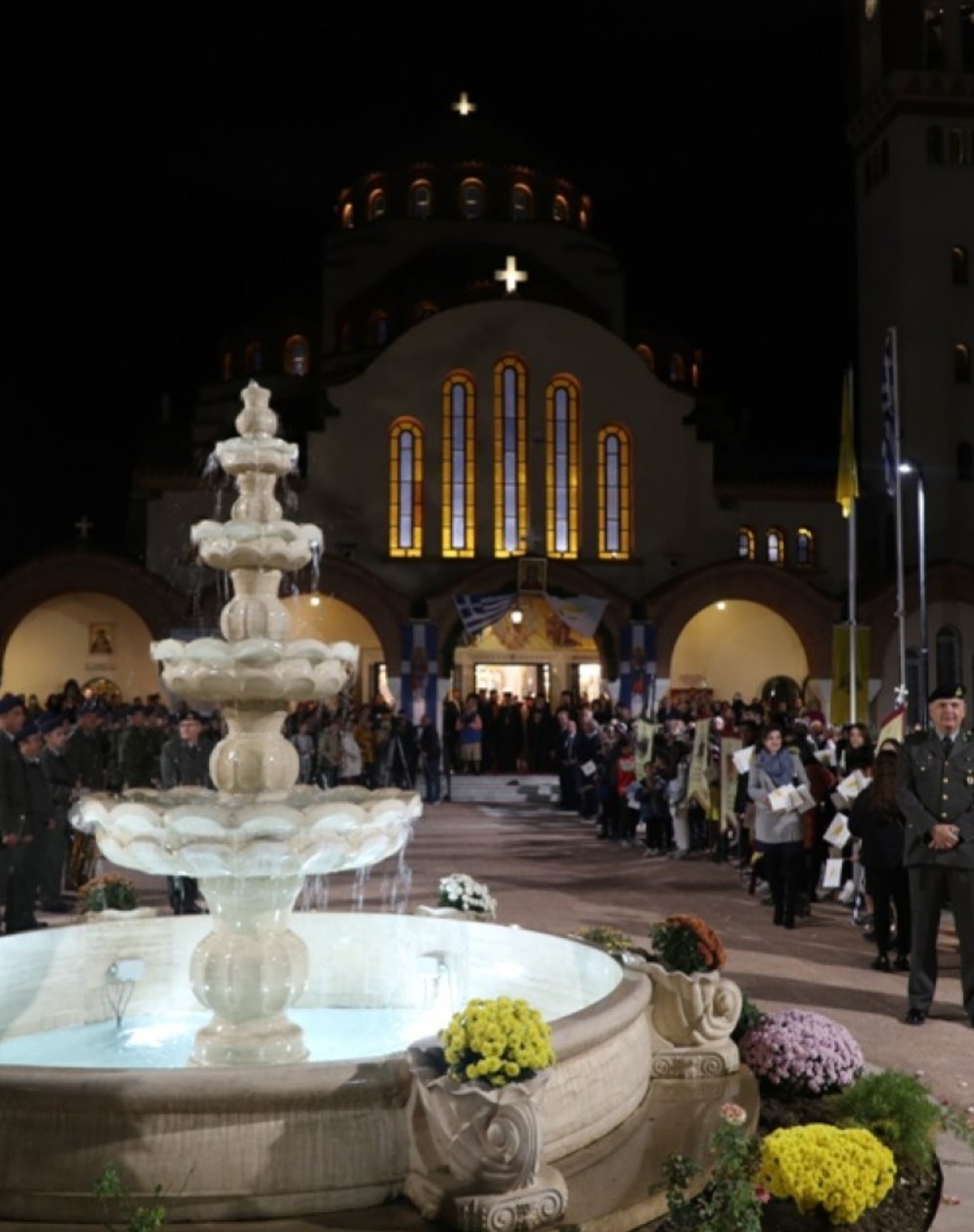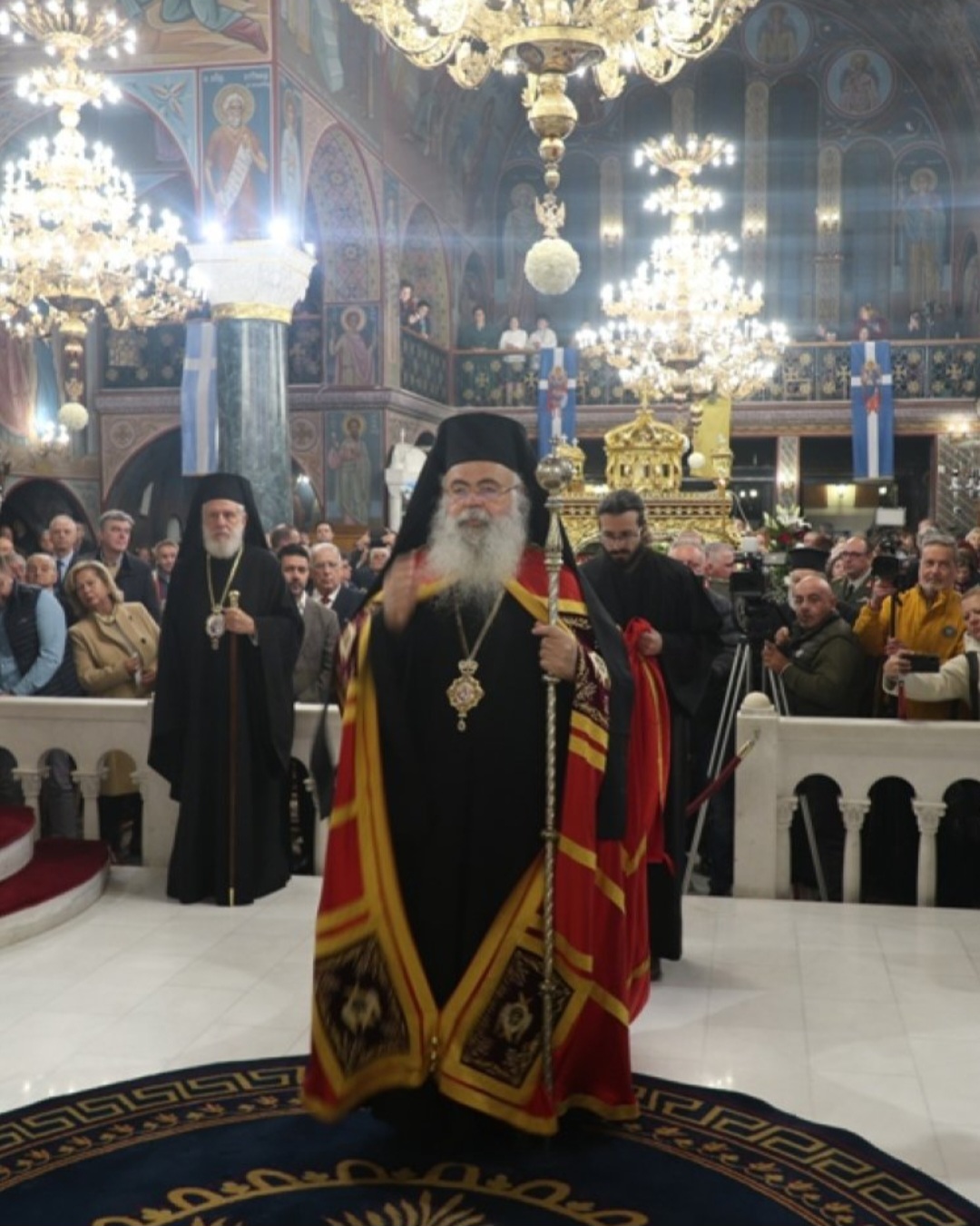 Προηγουμένως, στα προπύλαια του Ναού πραγματοποιήθηκε μεγαλοπρεπής υποδοχή του Μακαριωτάτου Αρχιεπισκόπου Κύπρου κ. Γεωργίου, με τη συμμετοχή πλήθους παιδιών με Ελληνικές και Κυπριακές σημαίες, στρατιωτικού αγήματος και φιλαρμονικής, Βουλευτών, Εκπαιδευτικών, του Γενικού Πρόξενου της Κύπρου στη Θεσσαλονίκη και εντυπωσιακού πλήθους πιστών.