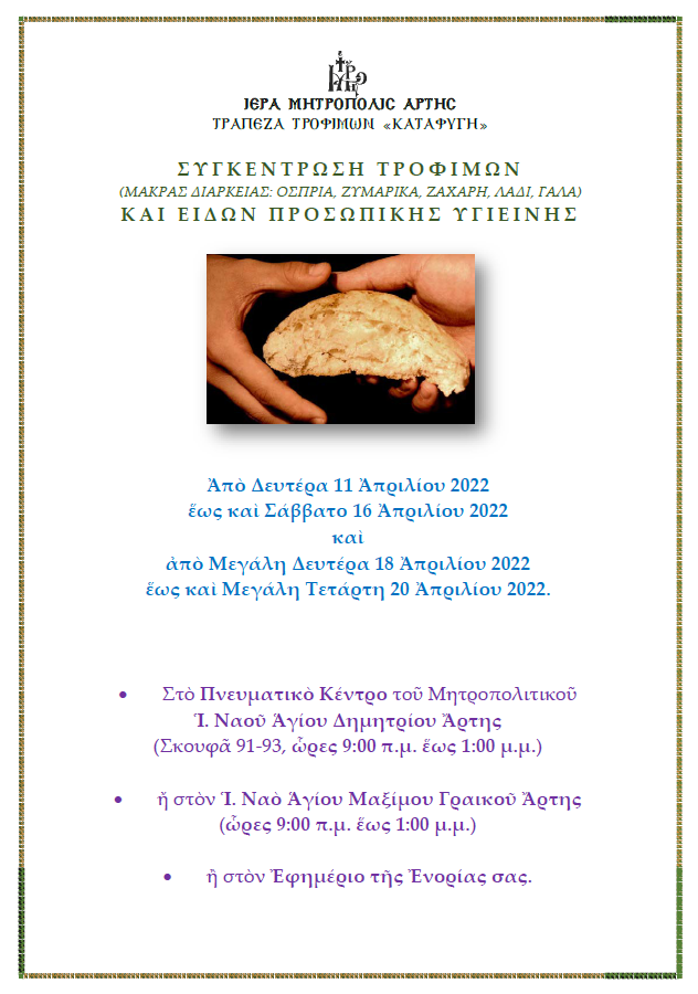 Εκκλησία της Ελλάδος Συγκέντρωση Τροφίμων & Ειδών Προσωπικής Υγιεινής 1 min read About The Author MARTYRIA.GR See author's posts Continue Reading Previous ”Οι Νεομάρτυρες της Πελοποννήσου”Next Εσπερινή προηγιασμενη θεία Λειτουργία μετά του Μεγάλου Κανόνος στην Νέα Ιωνία Διαβάστε επίσης 1 min read Εκκλησία της Ελλάδος Η προσφυγούπολη Ερμούπολη υπεδέχθη την πρόσφυγα ιερά και θαυματουργή εικόνα της Παναγίας «Ατταλειωτίσσης» 1 min read Εκκλησία της Ελλάδος “Λαμπρά Πανήγυρις της Πολιούχου του Αιγίου Ζωοδόχου Πηγής – Παναγίας Τρυπητής” 1 min read Εκκλησία της Ελλάδος Εγκύκλιος Σεβ. Μητροπολίτου Μάνης κ. Χρυσοστόμου Γ’ περί της χαράς των χριστιανών