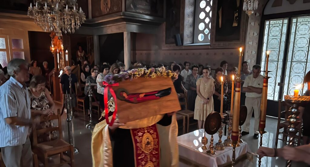 Μετά το πέρας των εγκωμίων ο εφημέριος του ναού περιέφερε τον επιτάφιο της Παναγίας εντός του ναού προς ευλογία των πιστών.