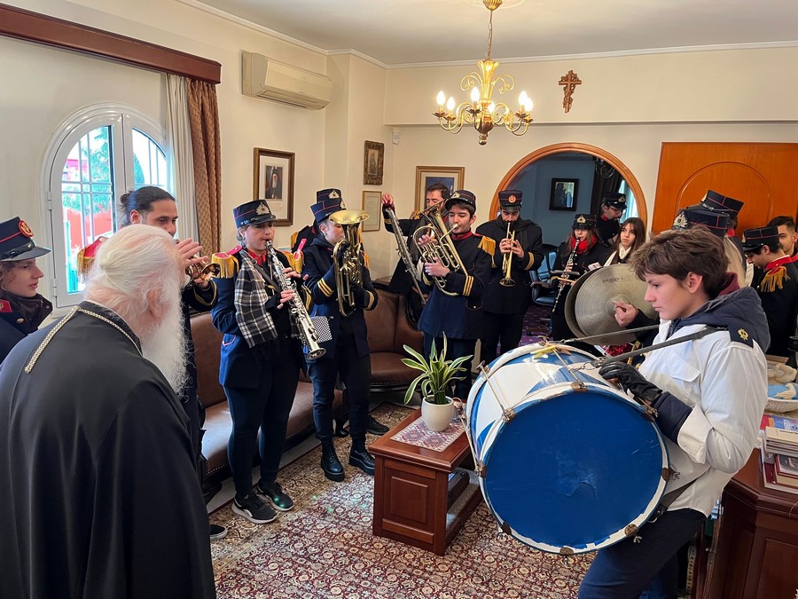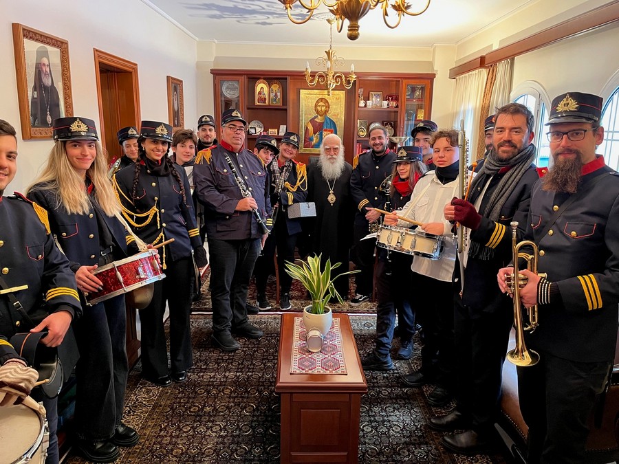 Σήμερα, παραμονή Πρωτοχρονιᾶς, ὁ Σεβασμ. Μητροπολίτης μας κ. Συμεών ὑποδέχτηκε στά Γραφεῖα τῆς Ἱερᾶς Μητροπόλεώς μας τήν Φιλαρμονική τοῦ Δήμου Νέας Σμύρνης καθώς καί τά παιδιά τῶν Ἱερέων μας γιά νά τοῦ ψάλλουν τά «Κάλαντα τῆς Πρωτοχρονιᾶς».