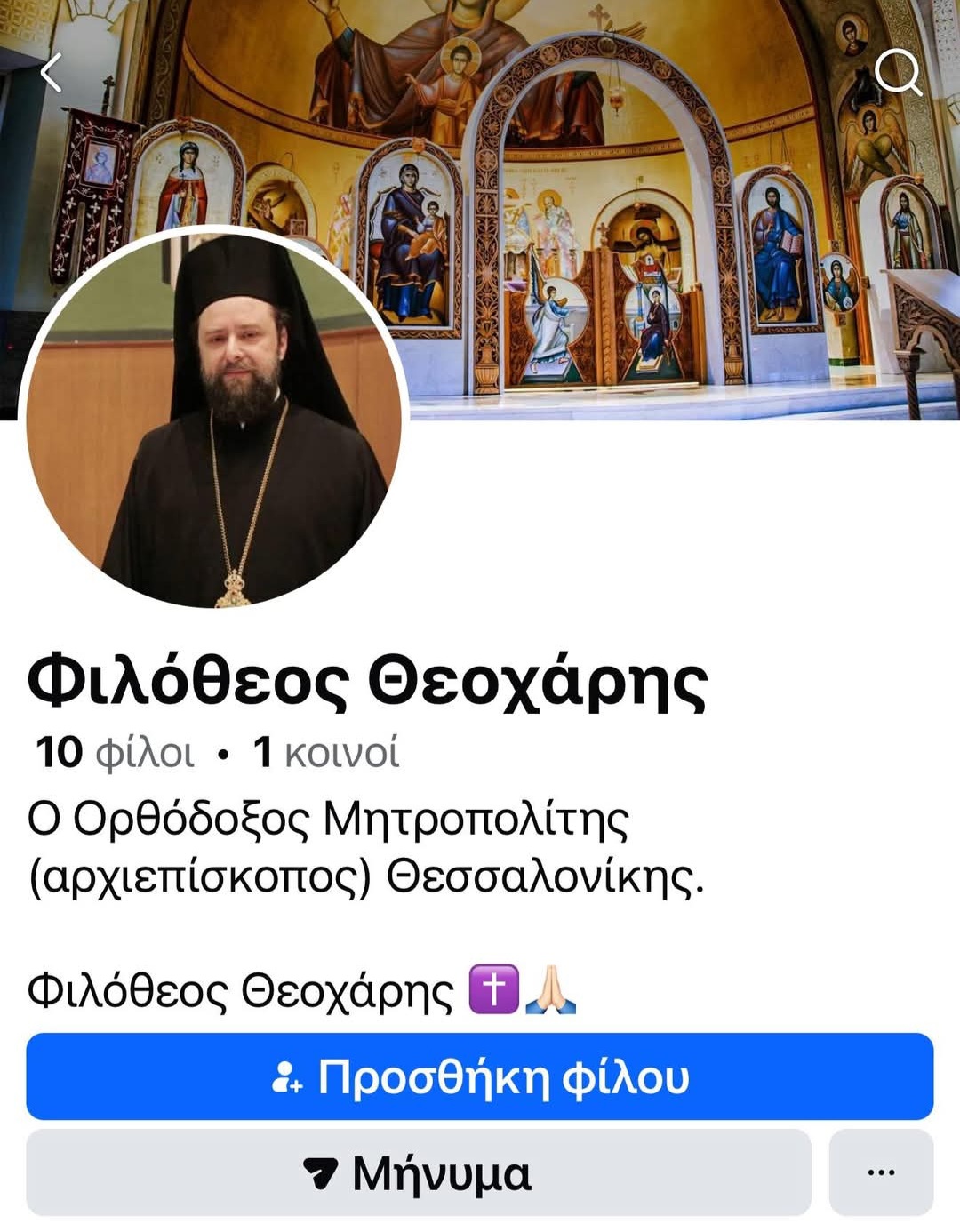 «Ενημερώνουμε τους χρήστες του διαδικτύου για μία νέα απόπειρα διαδικτυακής απάτης με θύμα το πρόσωπο του Μητροπολίτου Θεσσαλονίκης Φιλοθέου, καθόσον το εμφανισθέν προφίλ του μέσου κοινωνικής δικτύωσης Facebook με όνομα “ Φιλόθεος Θεοχάρης – ο Ορθόδοξος Μητροπολίτης (αρχιεπίσκοπος) Θεσσαλονίκης” και φωτογραφία του Μητροπολίτου Θεσσαλονίκης Φιλοθέου είναι ΨΕΥΔΕΣ και, ως εκ τούτου, καλούνται όσοι έχουν λογαριασμό στο μέσο αυτό κοινωνικής δικτύωσης, να απέχουν από οποιαδήποτε σύνδεση ή επικοινωνία με τους κρυπτομένους πίσω από αυτήν την διαδικτυακή απάτη», επισημαίνεται στην ανάρτηση.