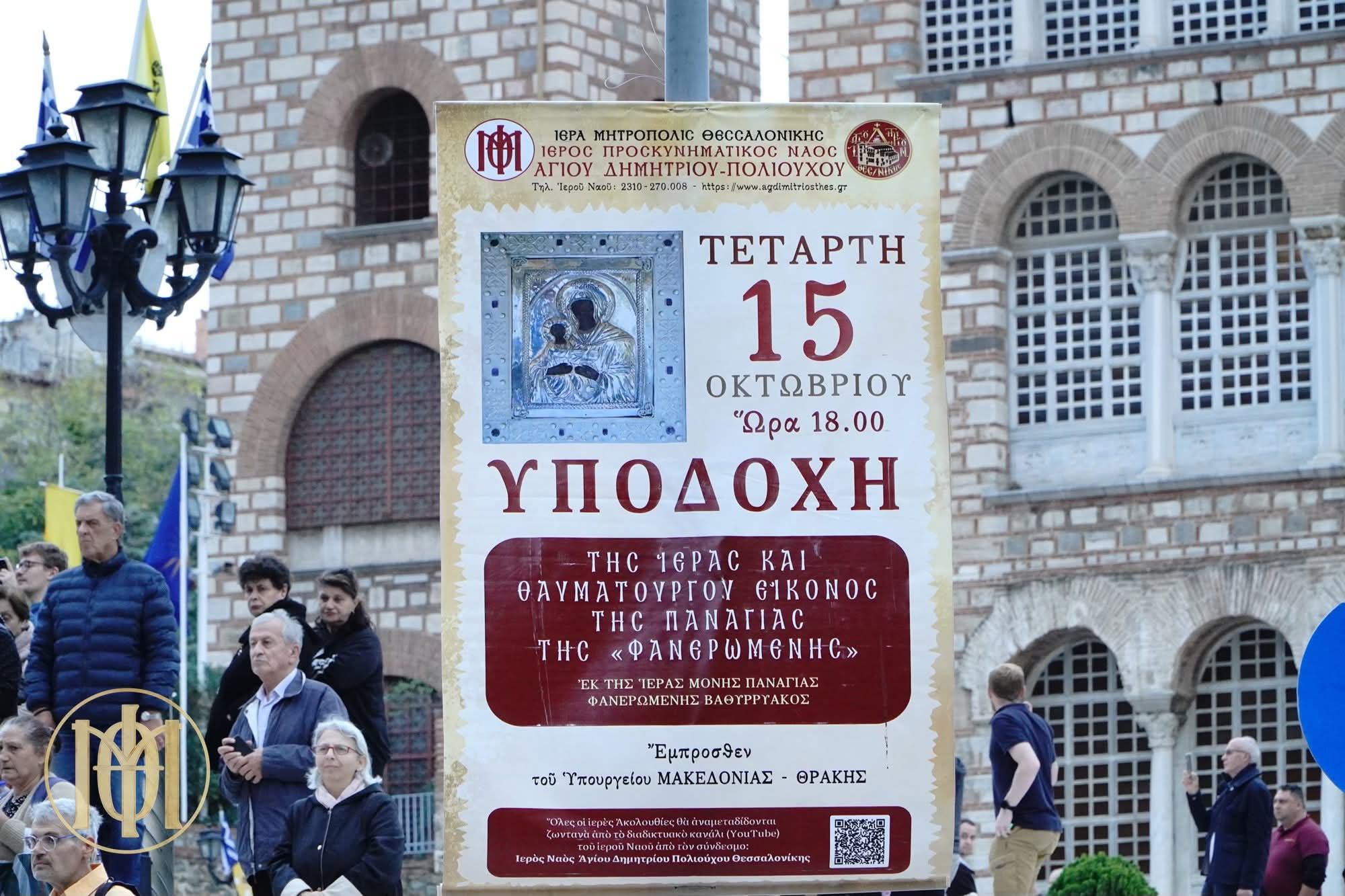 Σε κλίμα βαθιάς συγκίνησης αλλά και πνευματικής χαράς πραγματοποιήθηκε νωρίτερα στη Θεσσαλονίκη, μπροστά από το Διοικητήριο, η υποδοχή της εικόνας της Παναγίας Φανερωμένης «Βαθυρρύακος» από την ομώνυμη Μονή της Ιεράς Μητροπόλεως Μαρωνείας και Κομοτηνής.