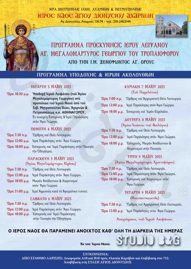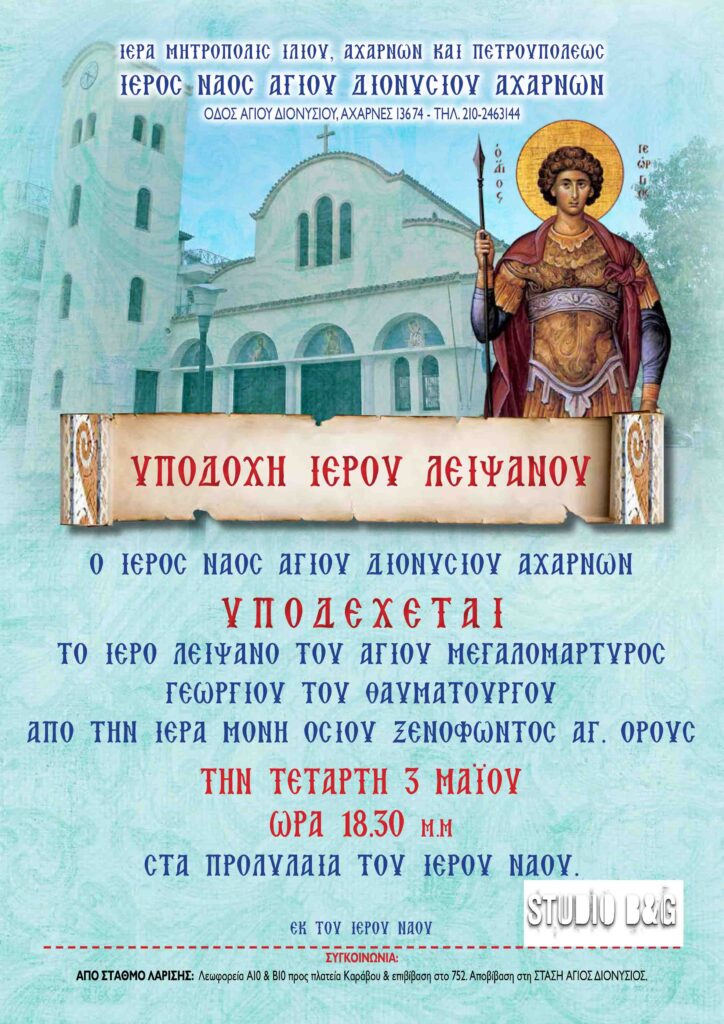 Το Εκκλησιαστικό Συμβούλιο του Ιερού Ναού Αγίου Διονυσίου Αχαρνών, με ιδιαίτερη χαρά, θέλει να σας προσκαλέσει να τιμήσετε διά της παρουσίας σας, την Τελετή Υποδοχής του Ιερού Λειψάνου του Αγίου Ενδόξου Μεγαλομάρτυρος Γεωργίου του Τροπαιοφόρου, Προστάτου και Εφόρου της Ιεράς Μονής Οσίου Ξενοφώντος Αγίου Όρους, η οποία θα πραγματοποιηθεί την Τετάρτη 3 Μαΐου 2023 και ώρα 6.30 μ.μ. στα προπύλαια του Ιερού Ναού μας.