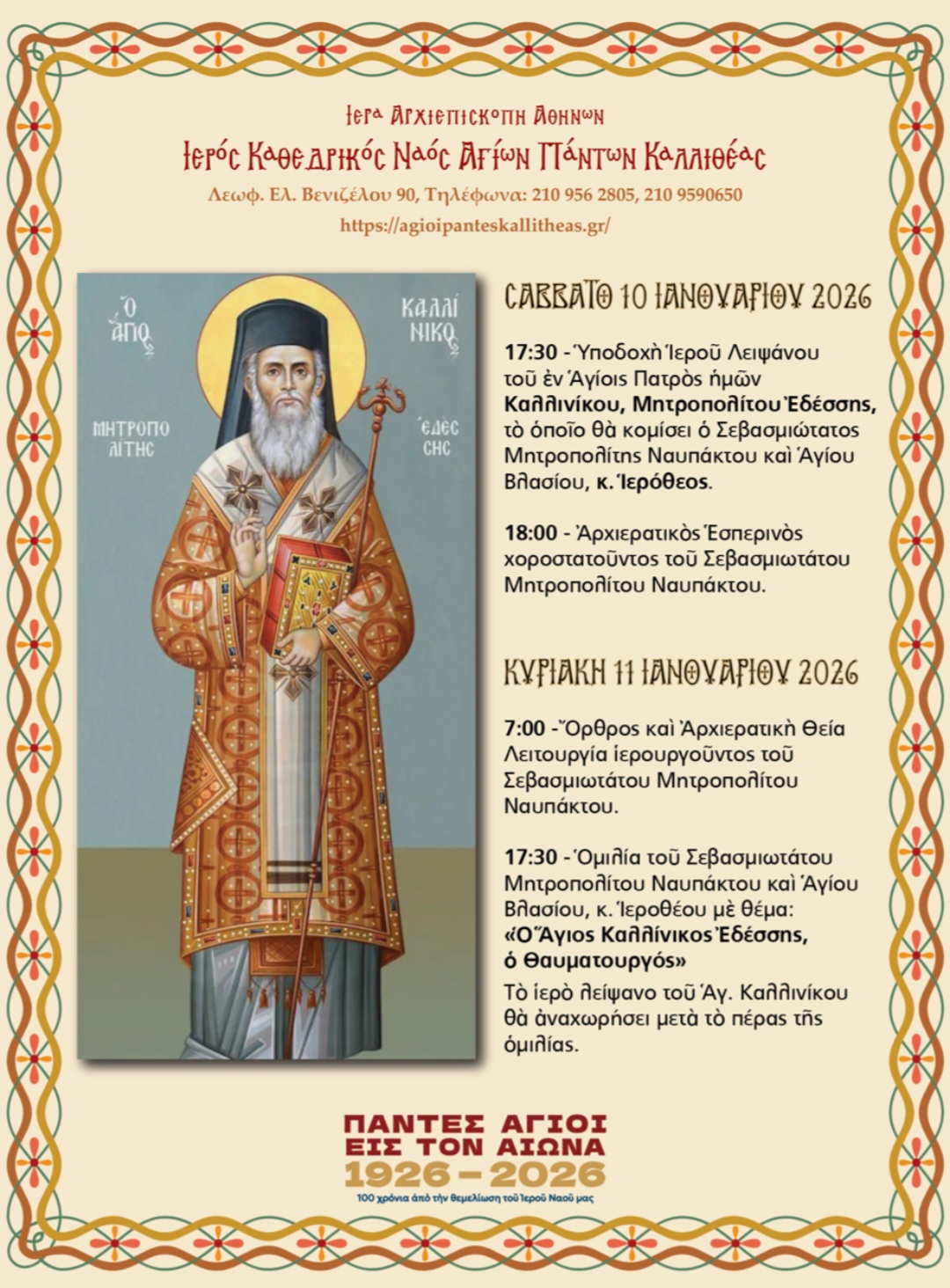 Η ενορία των Αγίων Πάντων Καλλιθέας υποδέχεται αύριο, Σάββατο, 10 Ιανουαρίου 2026, στις 17:30, το Ιερό Λείψανο του εν Αγίοις Πατρός ημών Καλλινίκου, Μητροπολίτου Εδέσσης, το οποίο θα κομίσει ο Σεβασμιώτατος Μητροπολίτης Ναυπάκτου και Αγίου Βλασίου κ. Ιερόθεος. Ακολούθως, θα τελεστεί αρχιερατικός εσπερινός.