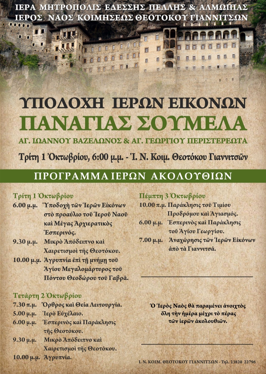 Την Τρίτη 1 Οκτωβρίου 2019, στις 6.00 μ.μ., θα πραγματοποιηθεί η επίσημη υποδοχή των ιστορικών ιερών εικόνων του Πόντου, της Παναγίας Σουμελά, του Αγ. Ιωάννου Προδρόμου Βαζελώνος και του Αγ. Γεωργίου Περιστερεώτα, στην πόλη των Γιαννιτσών.
