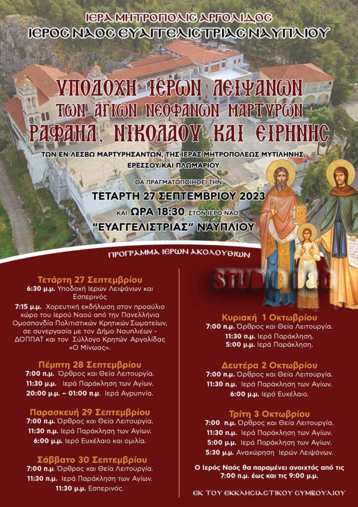 Την Τετάρτη 27 Σεπτεμβρίου στις 6:30 μ.μ. θα πραγματοποιηθεί υποδοχή των Ιερών Λειψάνων των Αγίων νεοφανών Μαρτύρων Ραφαήλ, Νικολάου και Ειρήνης στον Ι.Ν. Ευαγγελίστριας Ναυπλίου, από το νησί της Λέσβου.