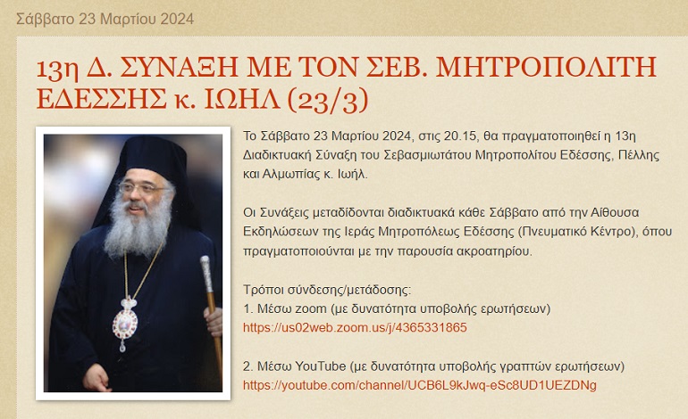 Το Σάββατο 23 Μαρτίου 2024, στις 20.15, θα πραγματοποιηθεί η 13η Διαδικτυακή Σύναξη του Σεβασμιωτάτου Μητροπολίτου Εδέσσης, Πέλλης και Αλμωπίας κ. Ιωήλ.