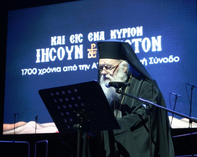 Ακολούθως προβλήθηκε το μήνυμα του Παναγιωτάτου Οικουμενικού Πατριάρχου κ. Βαρθολομαίου και αμέσως μετά ο Μακαριώτατος Αρχιεπίσκοπος Αθηνών και πάσης Ελλάδος κ. Ιερώνυμος απηύθυνε χαιρετισμό. Κατόπιν προβλήθηκε το ντοκυμανταίρ με θέμα την Α’ Οικουμενική Σύνοδο και τίτλο: «Καὶεἰς ἕνα Κύριον Ἰησοῦν Χριστόν», παραγωγής της Ιεράς Συνόδου της Εκκλησίας της Ελλάδος.